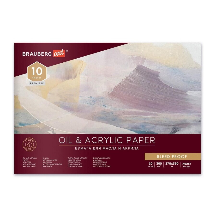 Альбом / бумага художественная для рисования маслом и акрилом 300 г/м2, 270х390 мм, 10 листов, склейка, тиснение холст, Brauberg Art Premiere
