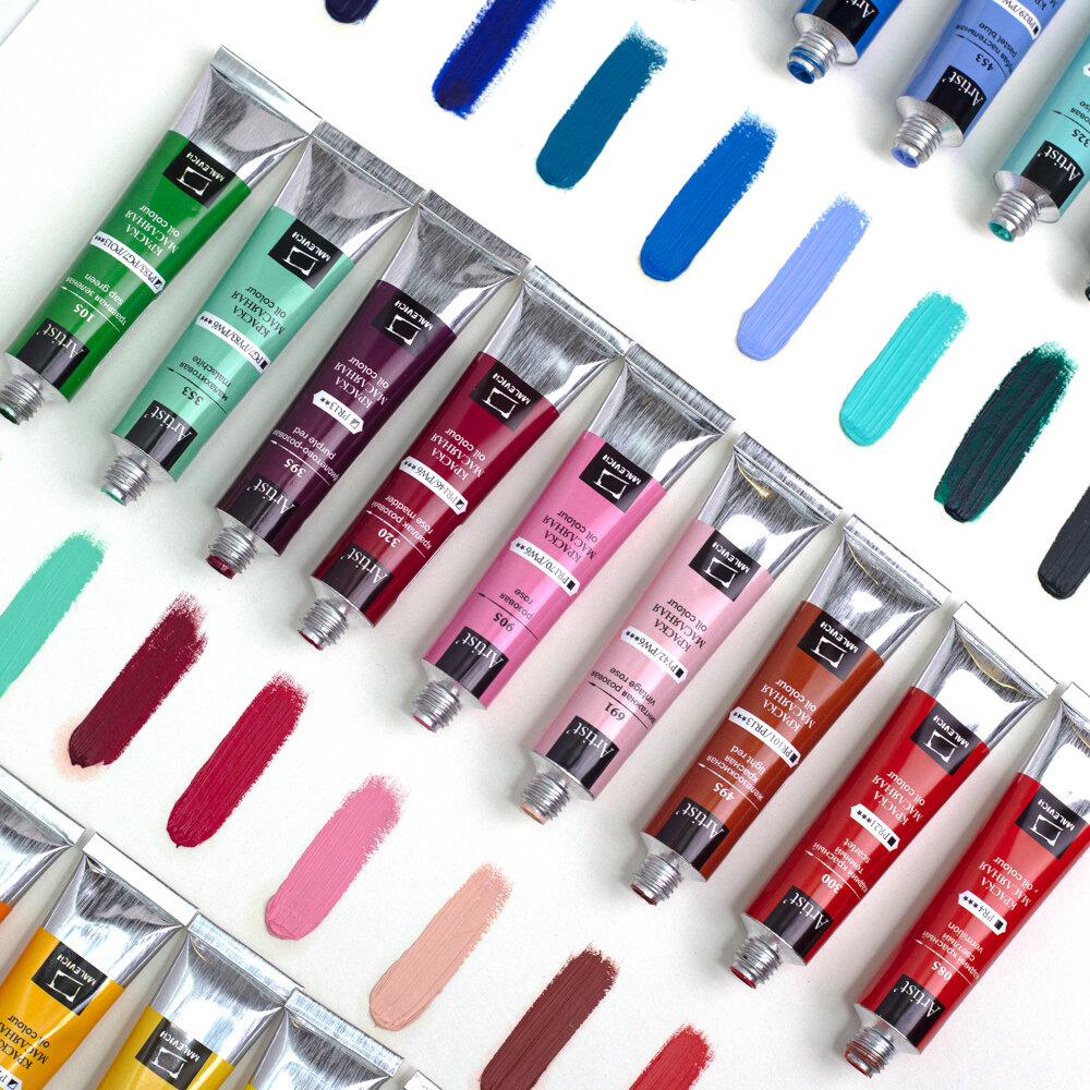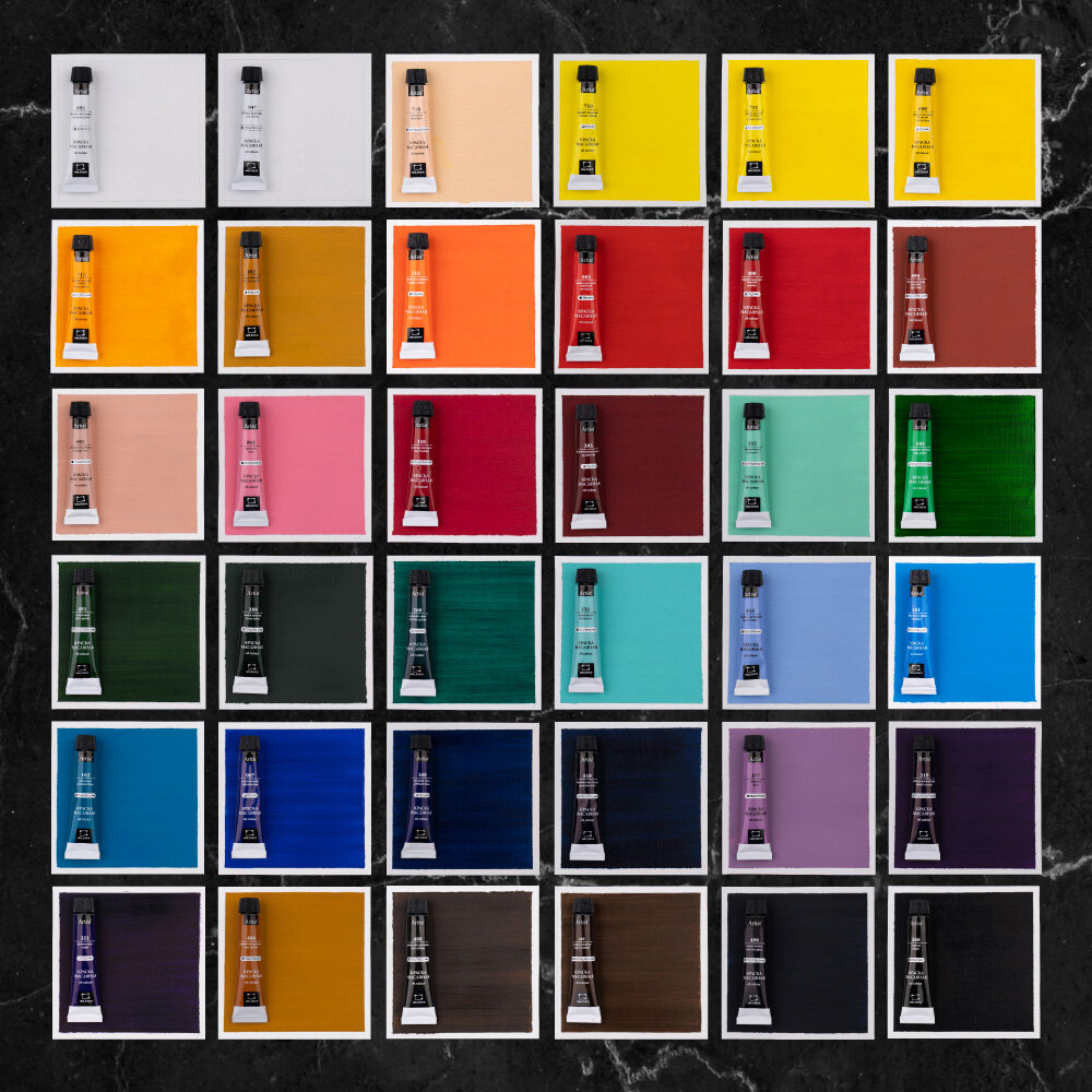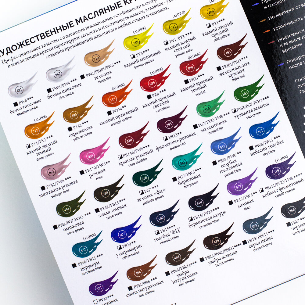 | Комплектация | Масляные краски (масло) 36 цветов по в тюбиках по 12 мл. Цвета: белила титановые, белила цинковые, телесная, кадмий лимонный, кадмий желтый светлый, кадмий желтый средний, кадмий желтый темный, охра желтая, кадмий оранжевый, кадмий красный светлый, кадмий красный темный, железоокисная красная, винтажная розовая, розовая, краплак розовый, фиолетово-розовая, малахитовая, травяная зеленая, оливковая, земля зеленая, зеленая ФЦ, бирюзовая, голубая пастельная, небесно голубая, церулеум, голубая ФЦ, ультрамарин, берлинская лазурь, лиловая, кобальт фиолетовый, фиолетовая, сиена натуральная, умбра натуральная, умбра жженая, серая пейна, черная |