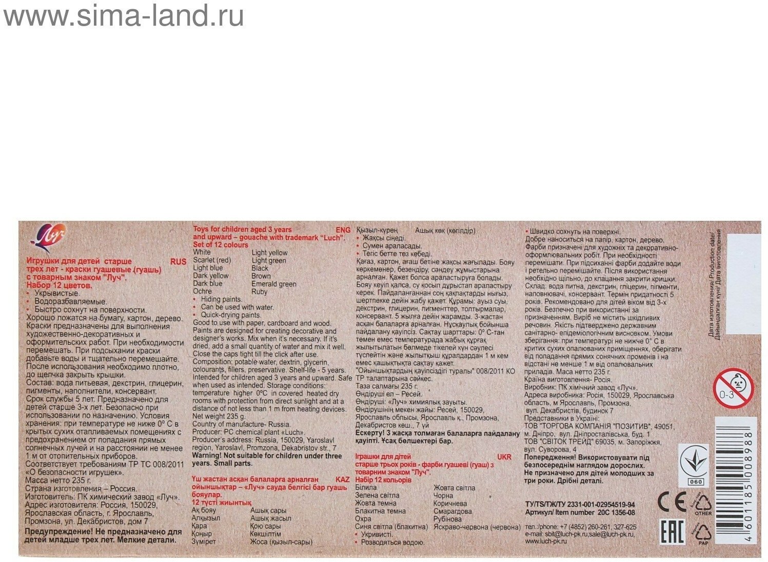 | Комплектация | Гуашь Луч ZOO 20С 1356-08упаковка 12 шт. |