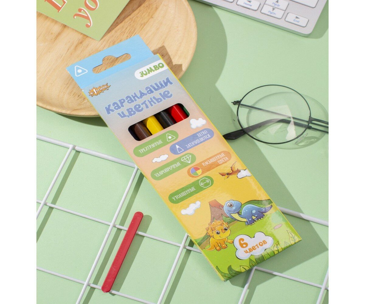 Цветные карандаши №1 School "Дино", трехгранные, утолщенные, 6 шт