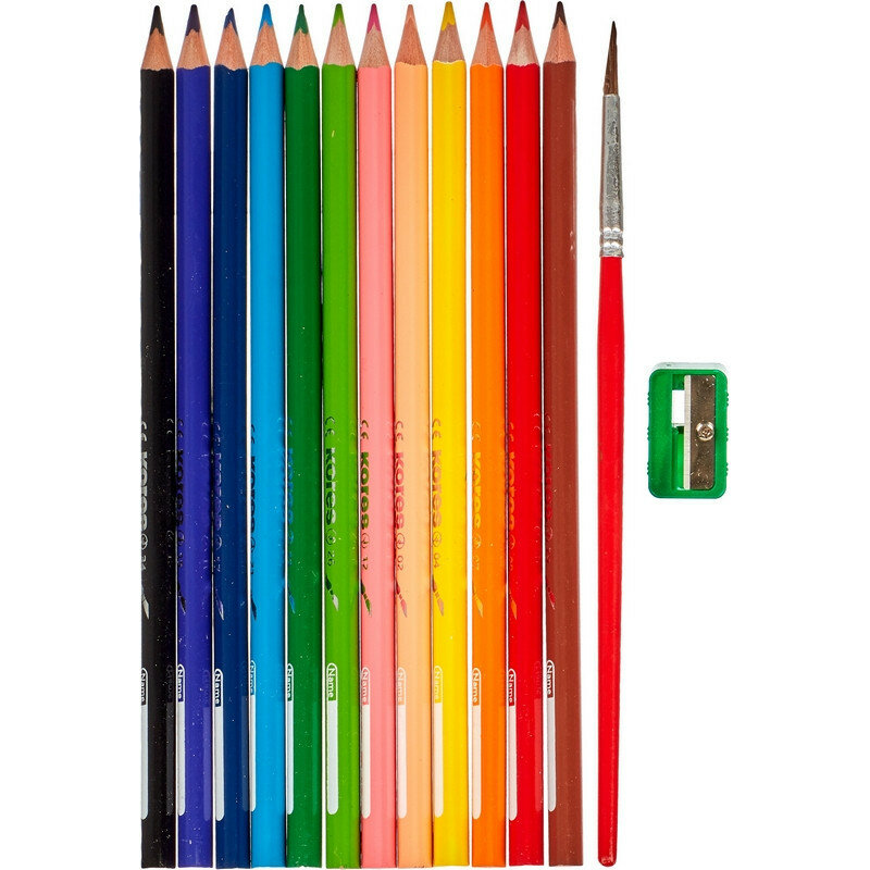 Карандаши цветные Kores, трехгранные, толщина грифеля 5 мм, набор 12 цветов+точилка и кисть