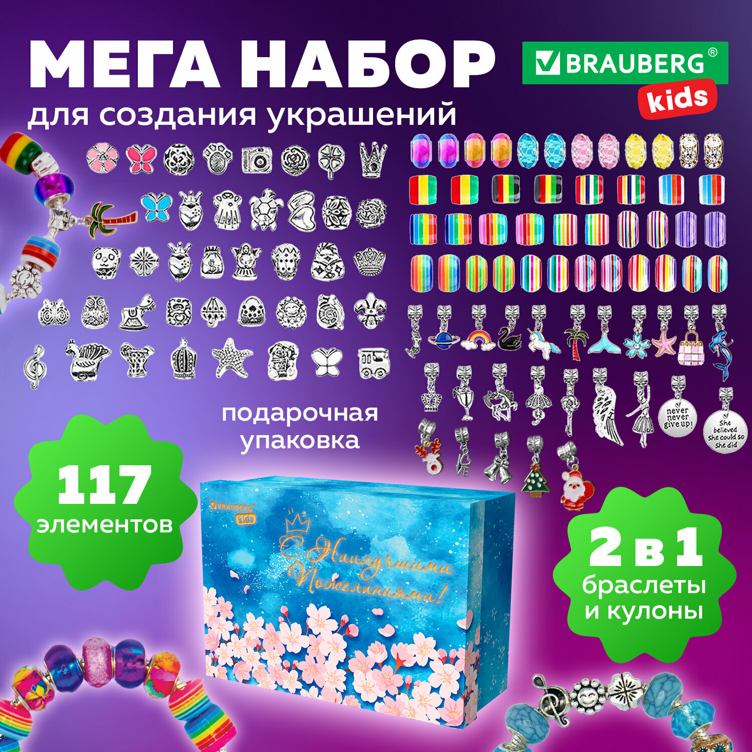 Набор для творчества и создания украшений и браслетов для девочек подарочный детский 117 элементов, бусины, подвески для рукоделия, Brauberg Kids, 665293