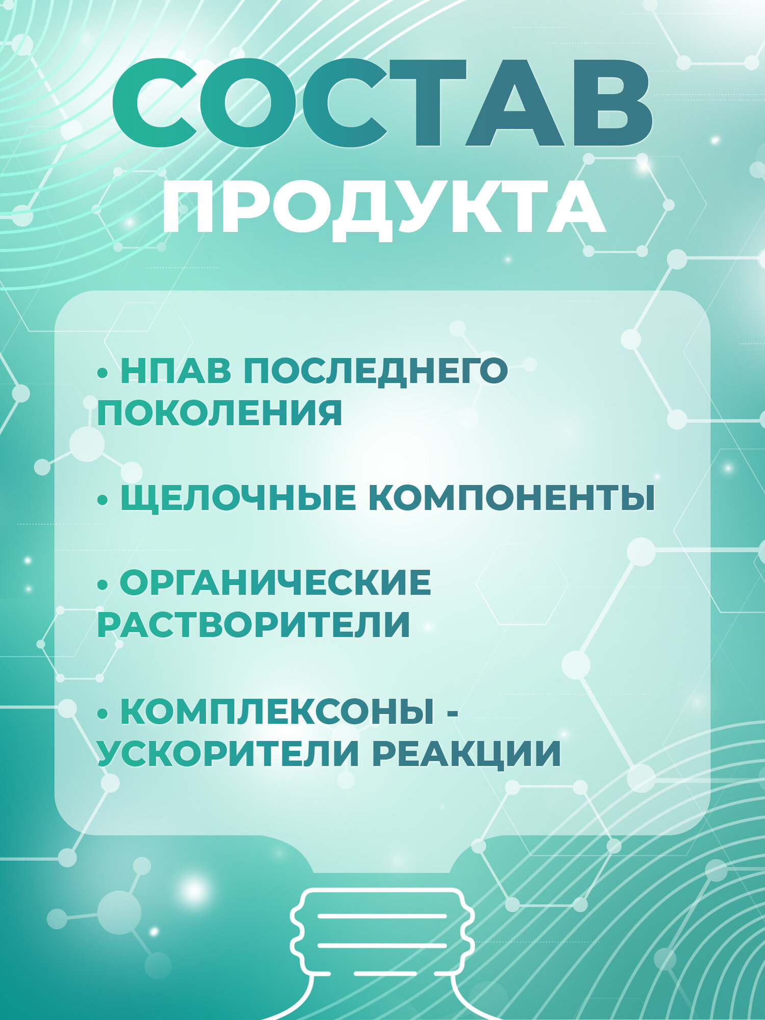 | Способ применения | 50-100 мл.на 10 л.воды. НЕОБХОДИМО ПРИМЕНЯТЬ ПЕРЧАТКИ!Для смягчения тканей после применения можно использовать «Кислотный ополаскиватель» |