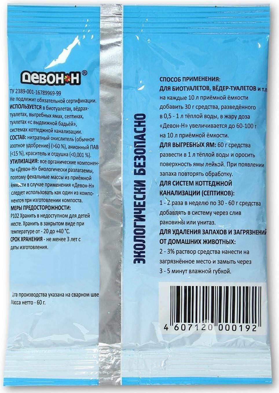 Порошок для биотуалетов, выгребных ям и септиков Девон-Н, 60 г