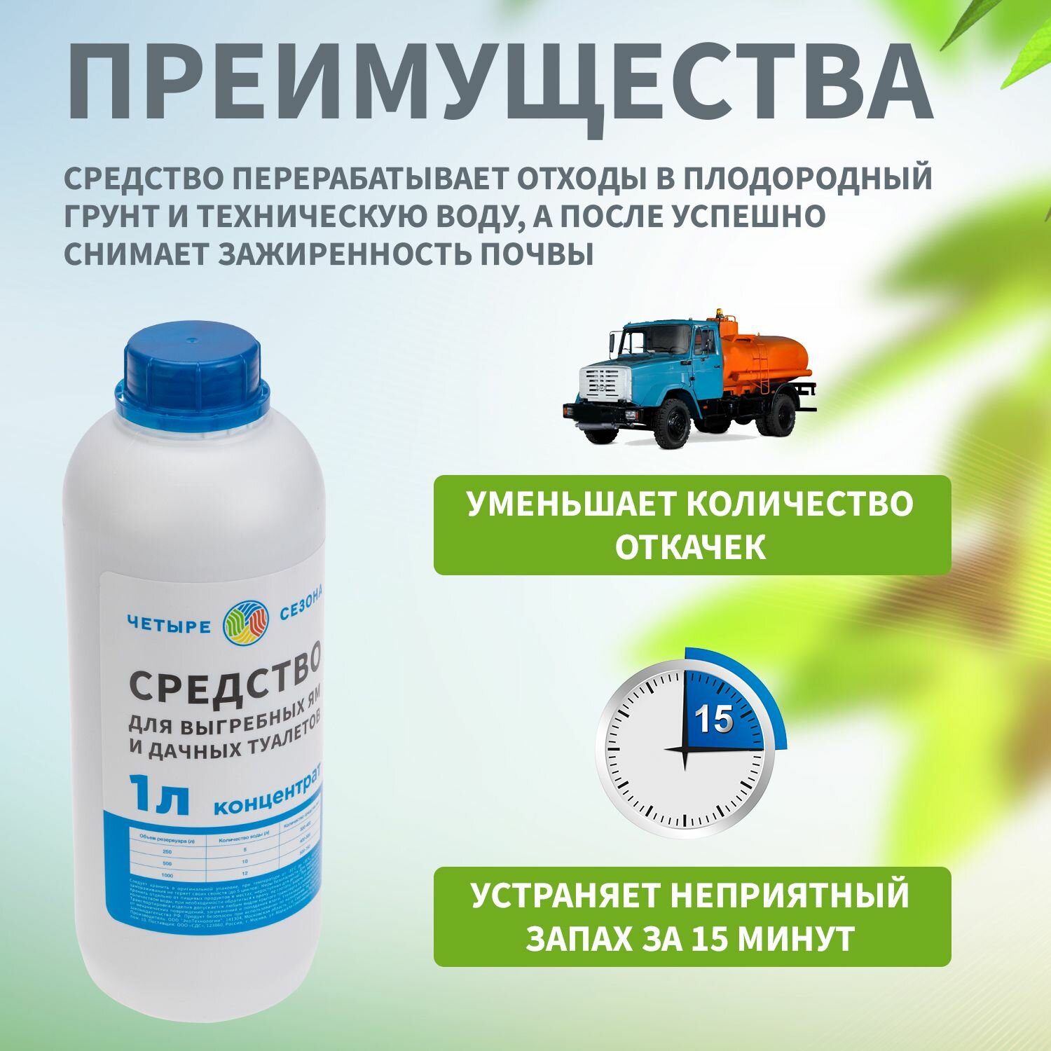Бактерии для септиков, жидкость для биотуалетов в верхний бачок 1 литр Четыре Сезона