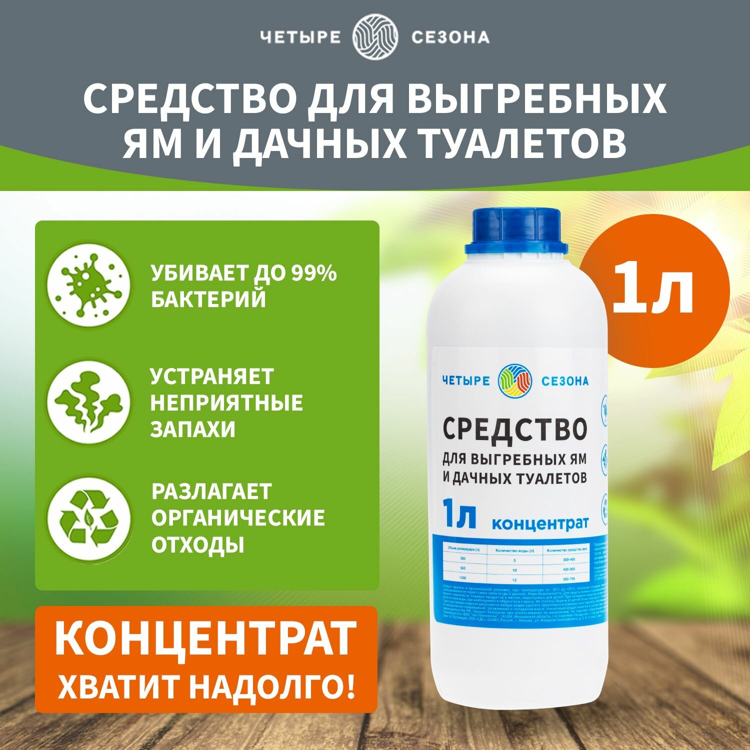 Бактерии для септиков , жидкость для биотуалетов в нижний бак 1 литр Четыре Сезона