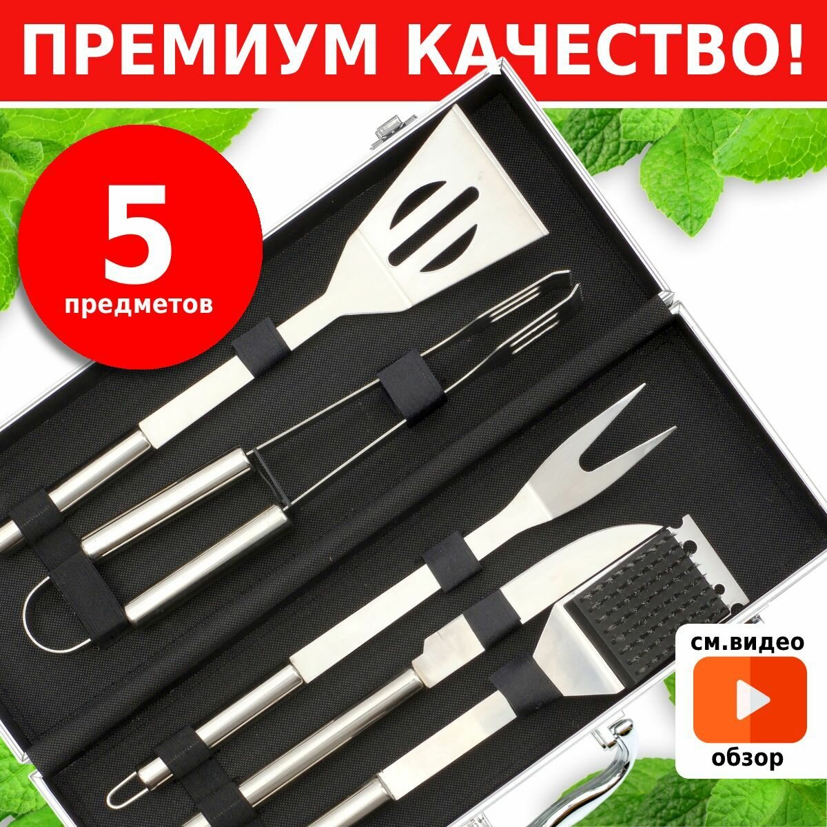 | Комплектация | - лопатка для гриля ; - щипцы для гриля ; - вилка для гриля ; - щетка для гриля ; - нож; алюминиевый чемодан. |