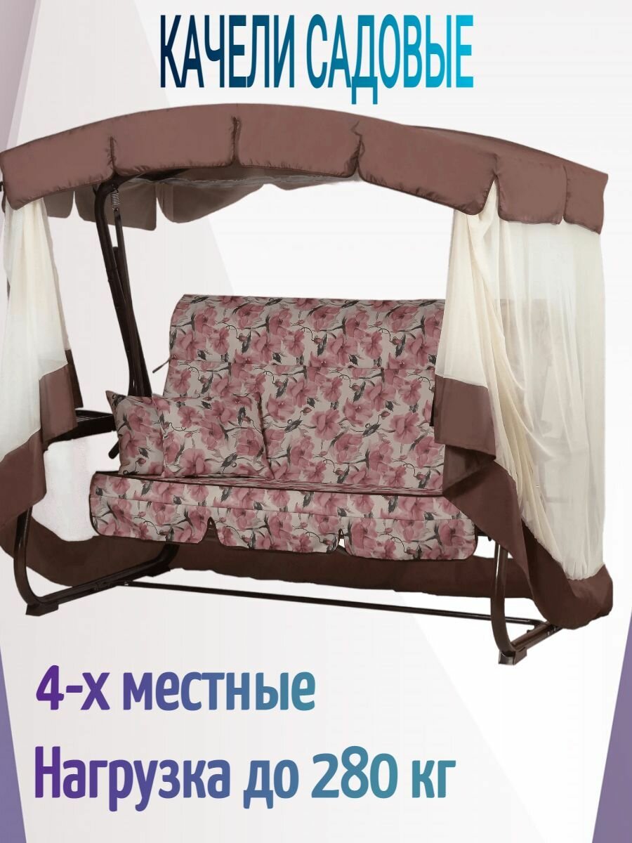Качели-павильон садовые 4-х местные (до 280 кг), цвет коричнево-розовый. Тент надежно защитит от солнца. Станут отличным местом отдыха на вашем приусадебном участке. интересное: