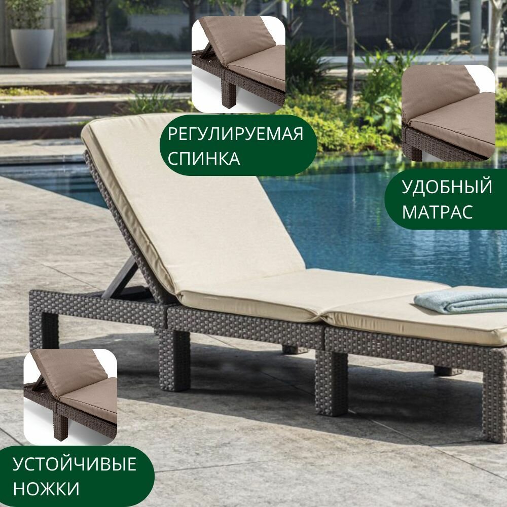 | Дополнительная информация | Размеры, см 195 х 65 х 25,5 Регулируемая спинка, подушки в комплекте, эргономичный дизайн, изготовлен из прочного пластика, неметаллическая рама - не ржавеет и не гниет, простая сборка без инструмента, благодаря стойкому к высоким температурам полипропилену, цвета не выгорают и не бледнеют, легко мыть и удобно хранить |