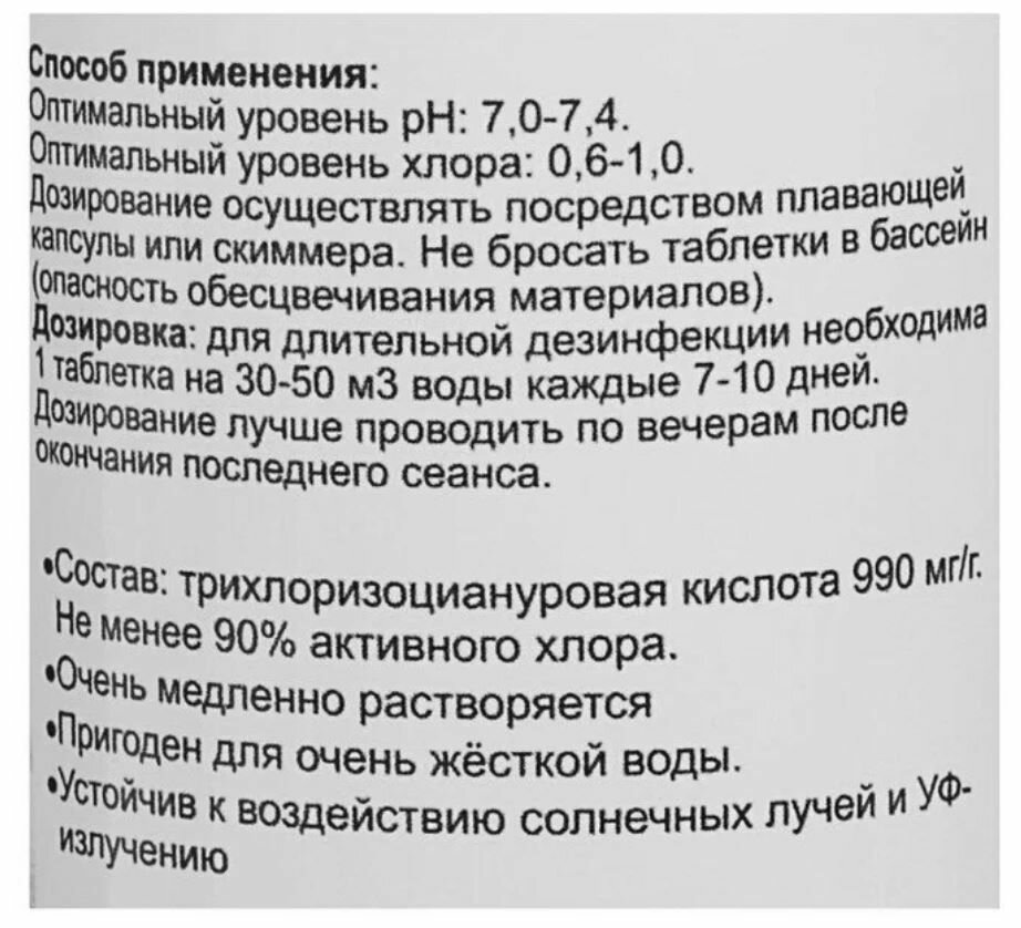 | Состав | Приготовлено с использованием трихлоризоциануровой кислоты, более 90% активного хлора. |