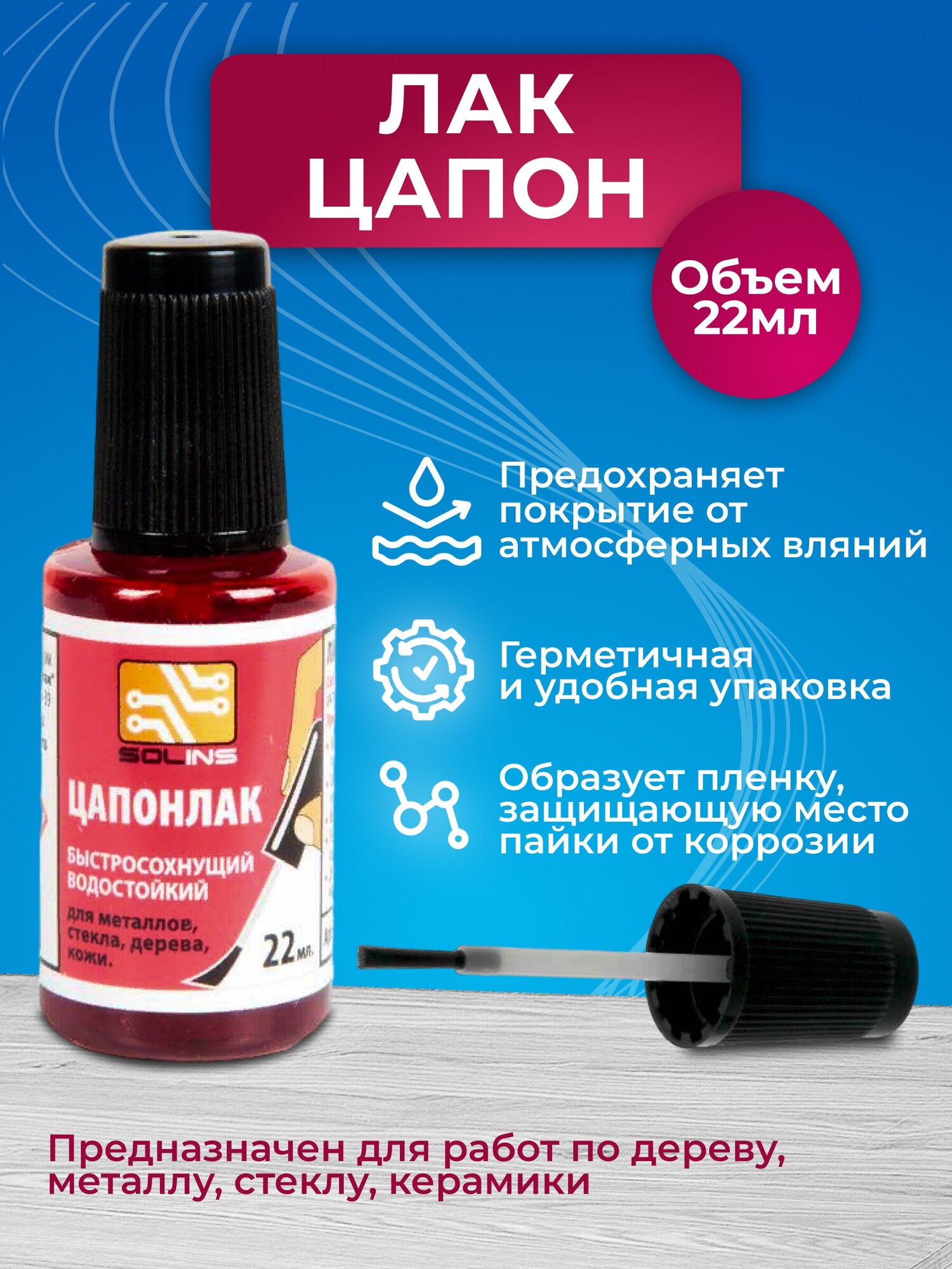 Цапон лак Solins быстросохнущий водостойкий, защитный для металла, стекла (ламп), дерева (древесины), кожи, печатных плат, цапонлак защита от коррозии для наружных и внутренних работ, бесцветный 22 мл