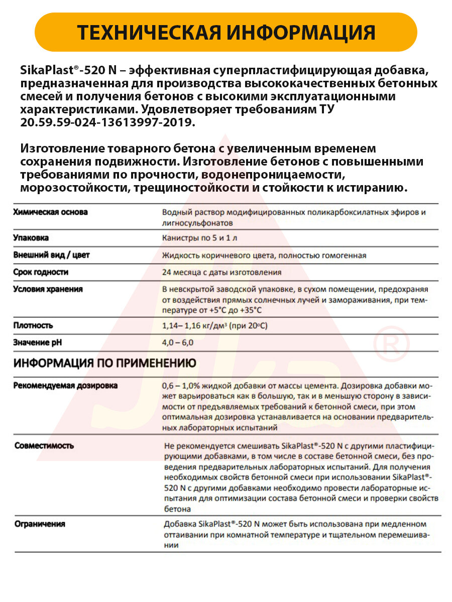 | Дополнительная информация | Суперпластификатор Sikaplast-520 N 5 л |