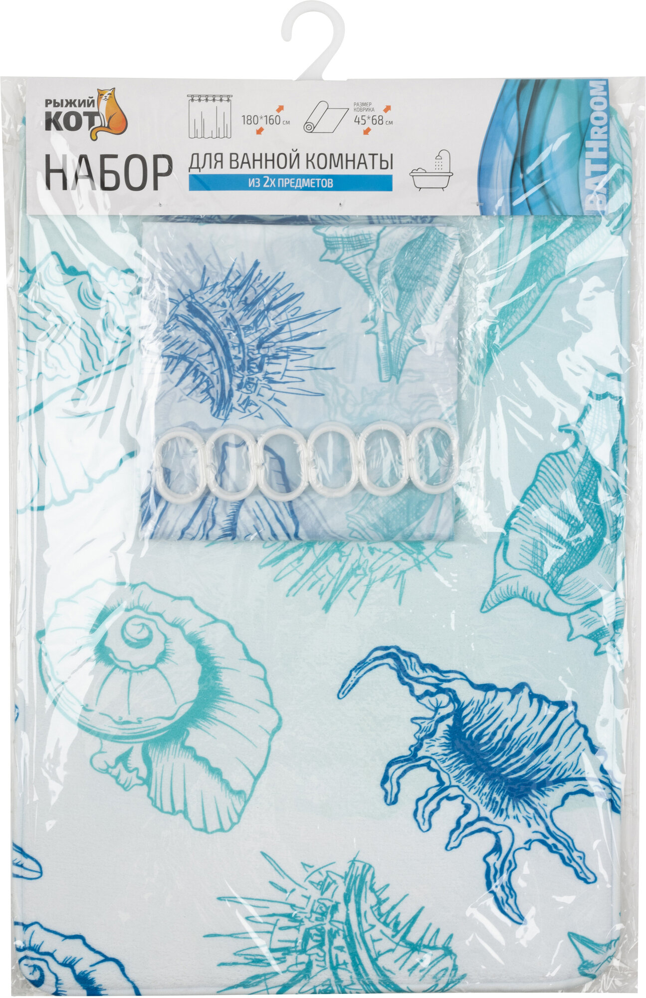 Набор для ванной Рыжий кот Ракушки, коврик + штора
