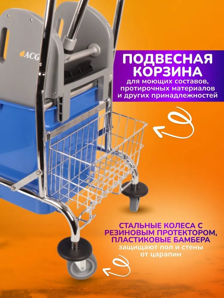 Тележка уборочная ACG 25 л., с отжимом, с корзиной для химии, рама хромированная