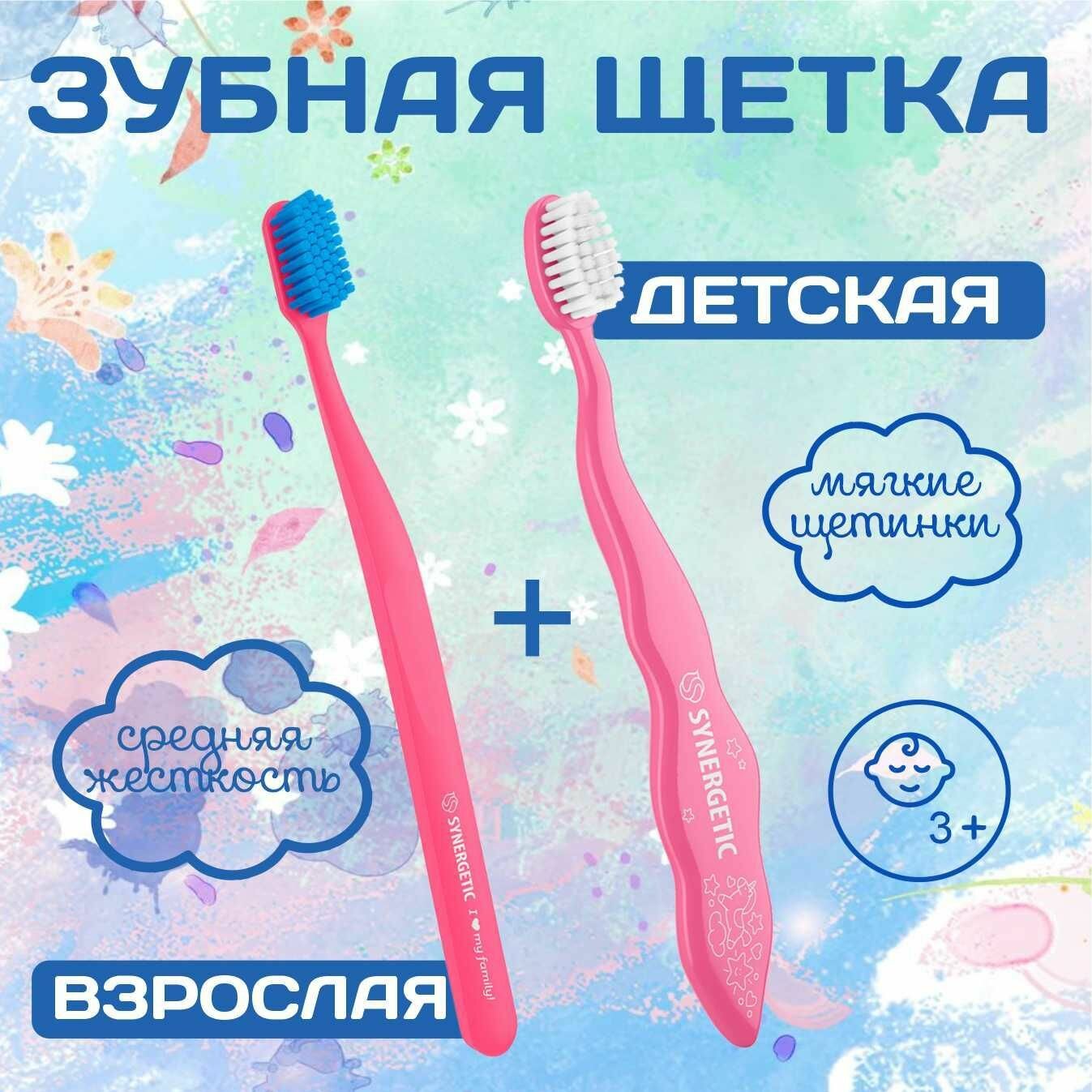 Купить Зубная щетка для взрослых Synergetic средней жёсткости + детская зубная щетка от 3 до 6 лет мягкая розовая