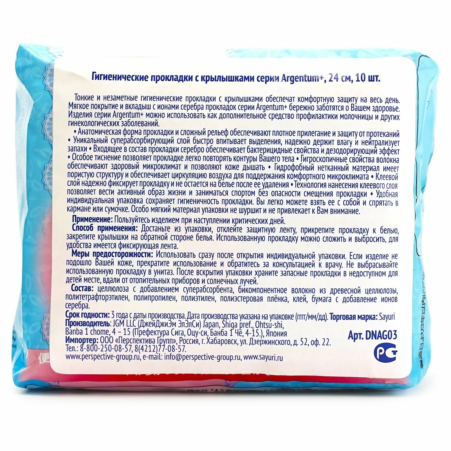 Sayuri Японские/Гигиенические прокладки Argentum+, нормал, 24 см, 10 шт