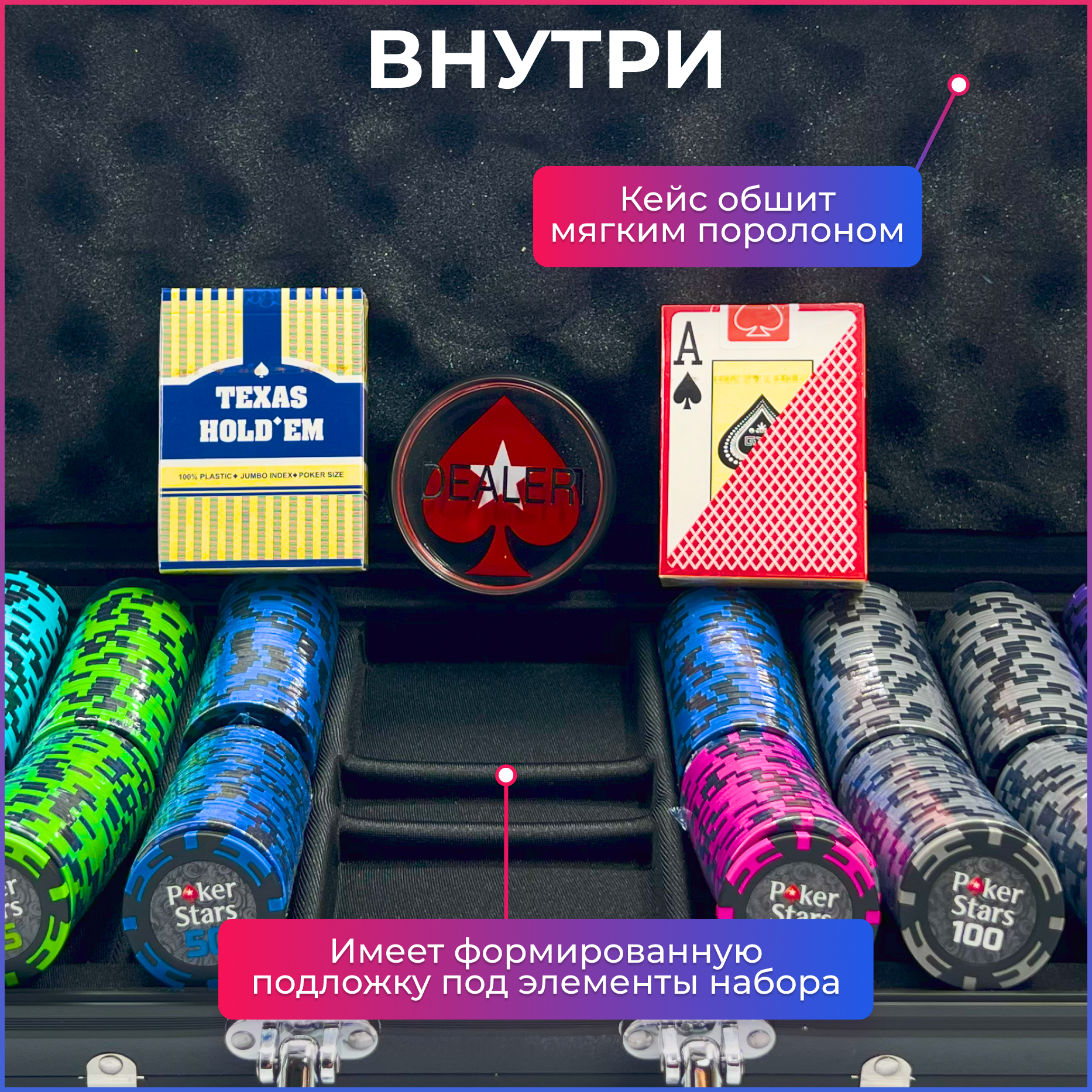 | В наборе | 500 фишек, 2 колоды пластиковых карт, акриловая фишка дилера |