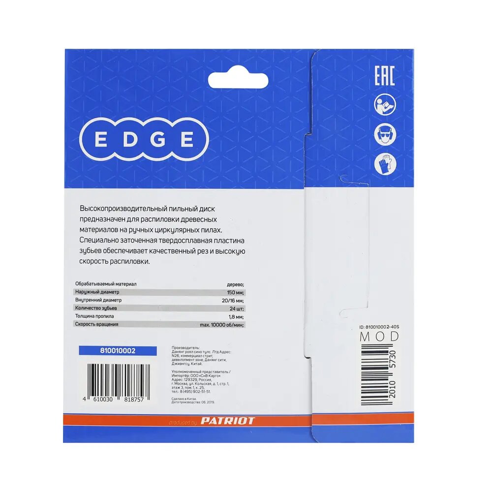Ниже Вы можете прочитать отзывы на Диск EDGE by PATRIOT пильный по дереву 150x24x20/16 810010002, ознакомится с подробными характеристиками, посмотреть интересные обзоры и фотографии на Диск EDGE by PATRIOT пильный по дереву 150x24x20/16 810010002.