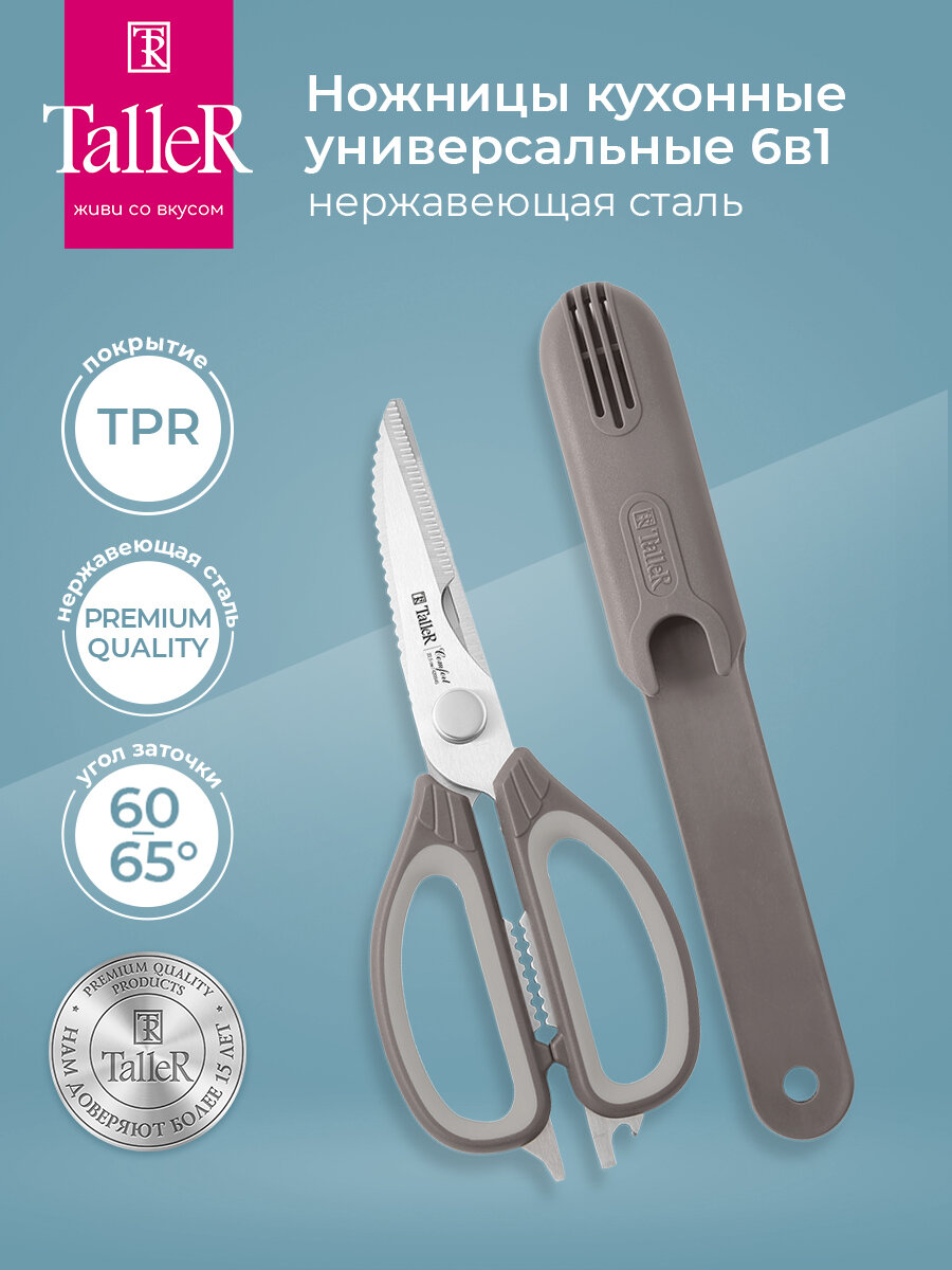 Ниже Вы можете прочитать отзывы на Ножницы кухонные универсальные бытовые TalleR TR-22094 с чехлом, ознакомится с подробными характеристиками, посмотреть интересные обзоры и фотографии на Ножницы кухонные универсальные бытовые TalleR TR-22094 с чехлом.