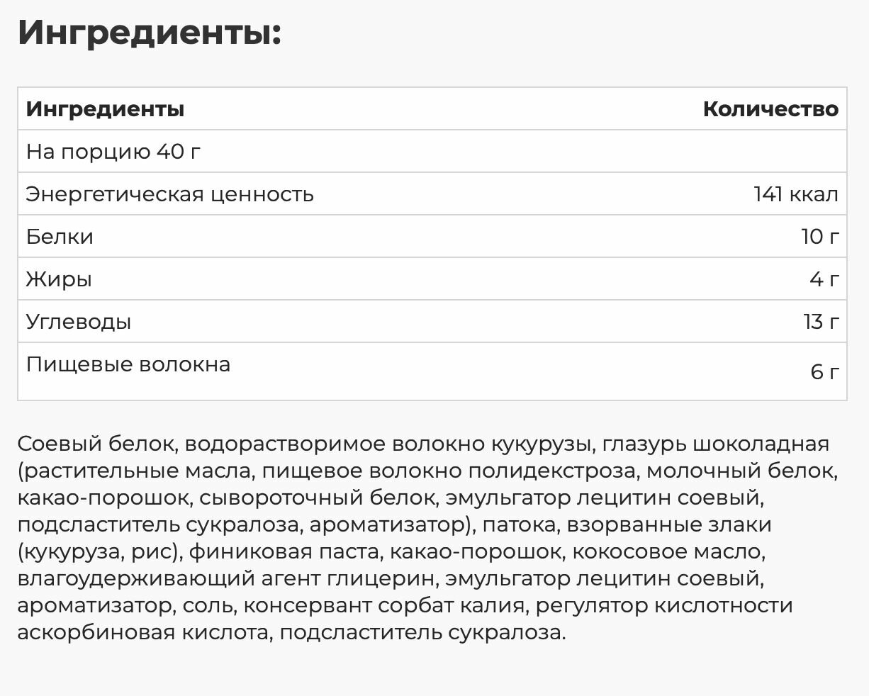 | Дополнительная информация | Пищевые волокна 17 гр/100 гр; назначение: Восстановление, насыщение белком, снижение аппетита, обогащение витаминами организма; рекомендации по применению: Употреблять не более 2-х штук в сутки; форма выпуска: батончик; состав: соевый белок, водорастворимое волокно кукурузы, глазурь шоколадная (растительные масла, пищевое волокно полидекстроза, молочный белок, какао-порошок, сывороточный белок, эмульгатор лецитин соевый, подсластитель сукралоза, ароматизатор), патока, взорванные злаки (кукуруза, рис), карамель молочная, финиковая паста, кокосовое масло, влагоудерживающий агент глицерин, эмульгатор лецитин соевый, ароматизаторы, соль, консервант сорбат калия, регулятор кислотности аскорбиновая кислота, подсластитель сукралоза |