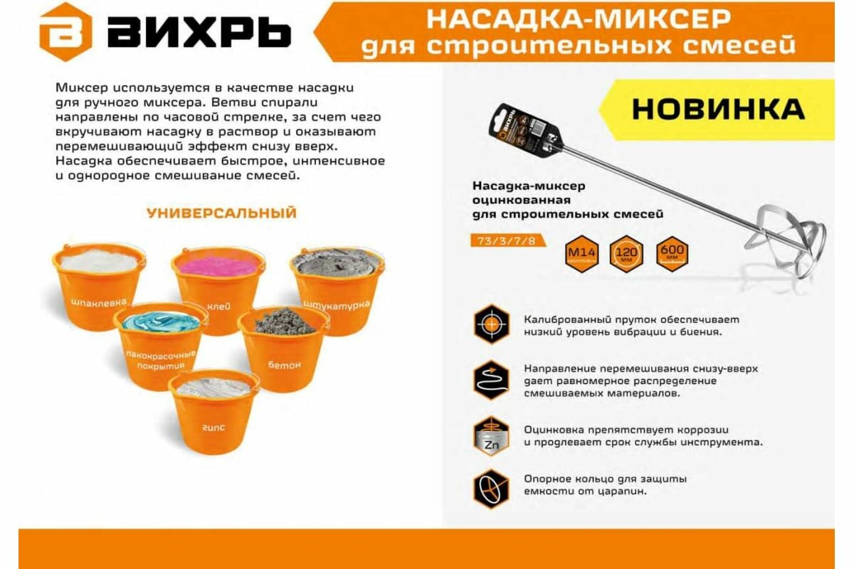 СохранитьНасадка-миксер оцинкованная вихрь 120х600 мм М14 для строительных смесей интересное: