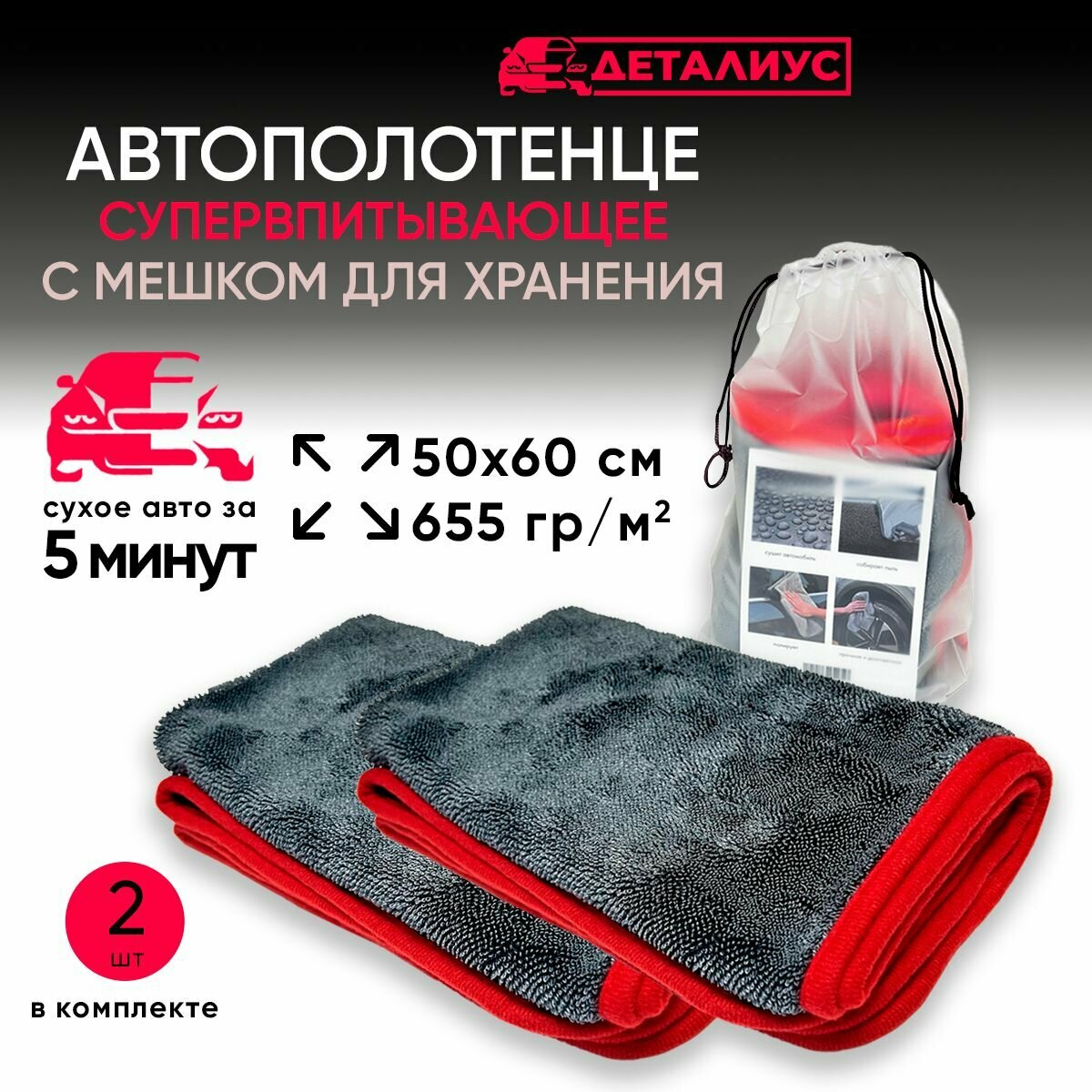 Автополотенце для сушки кузова Деталиус из микрофибры супервпитывающее большое 50*60 двустороннее с мешком для хранения - 2 шт. интересное:
