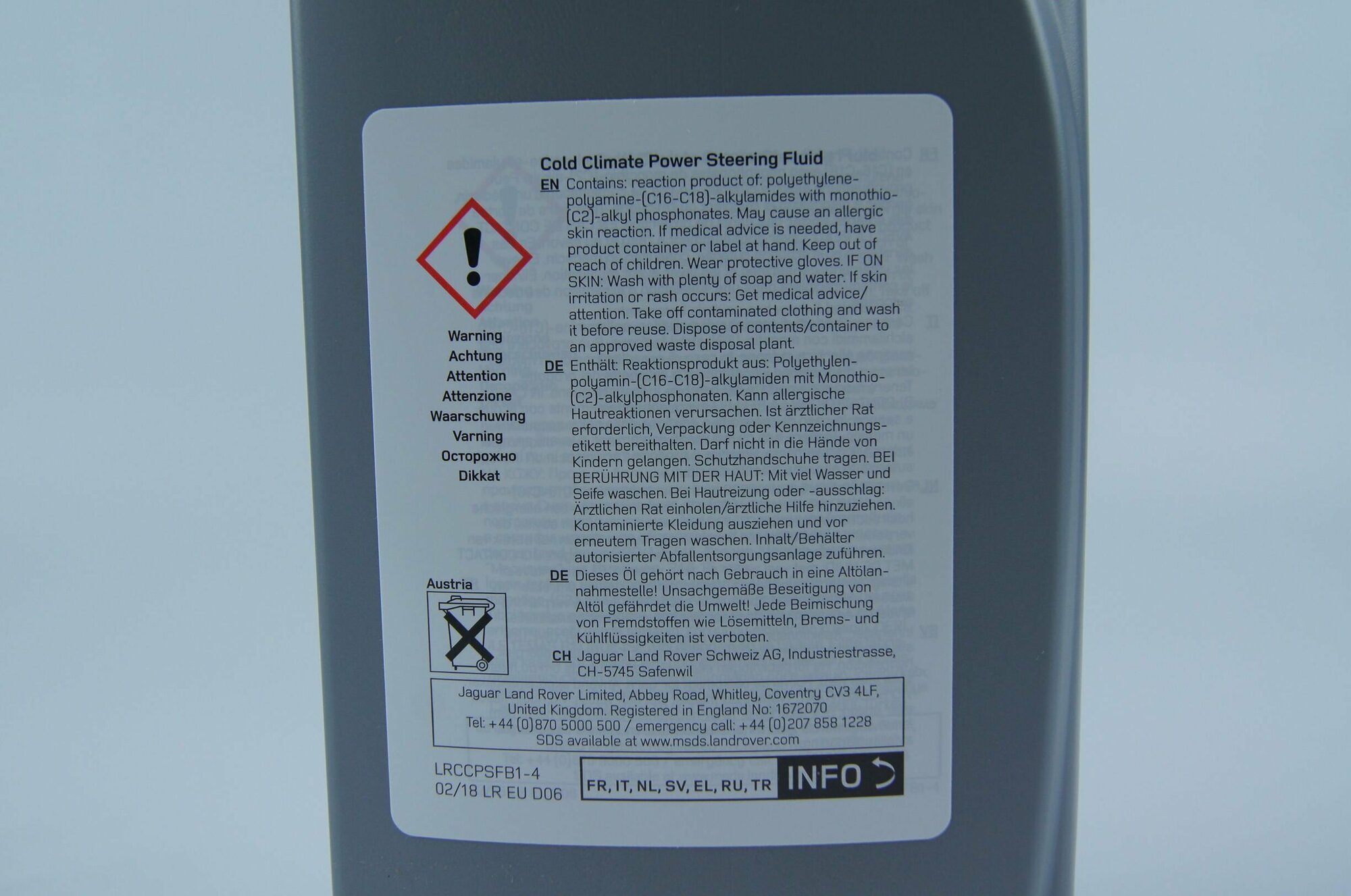 | Спецификация OEM жидкости ГУР | Land Rover Cold Climate PAS Fluid 14315 LRN2261 |