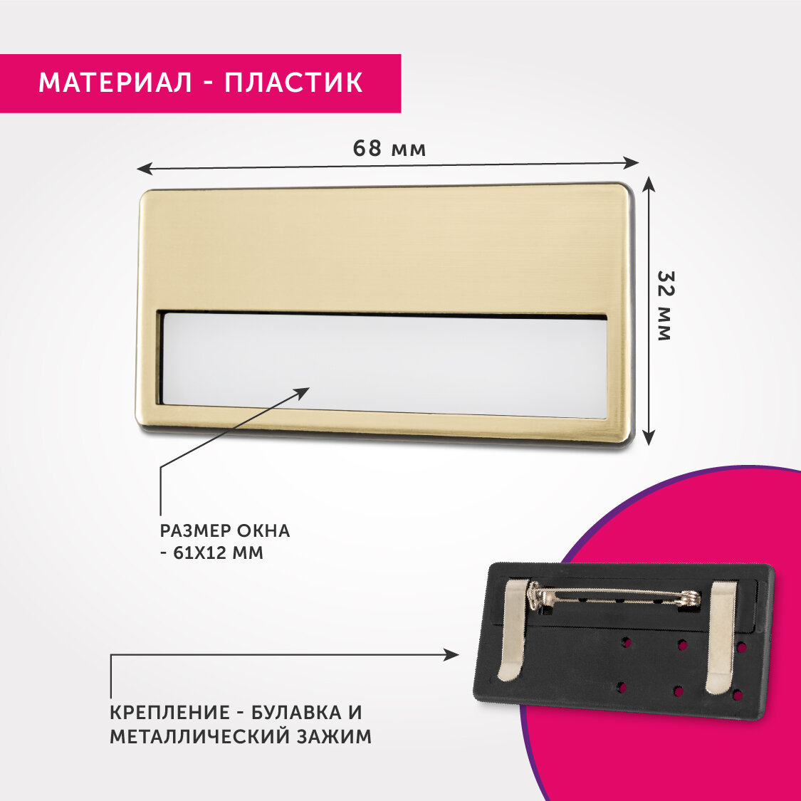 Бейдж пластиковый горизонтальный с окошком для персонализации 70х35 мм Fastmarket, Фастмаркет, на булавке с зажимом, золотистый