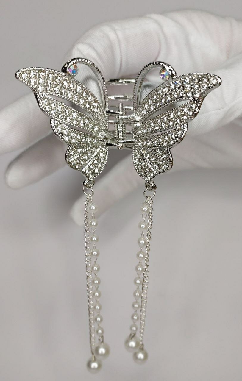 Купить Новинка 2023! Блестящий краб-бабочка для волос с кисточками из жемчужин (имитация). Цвет Серебро