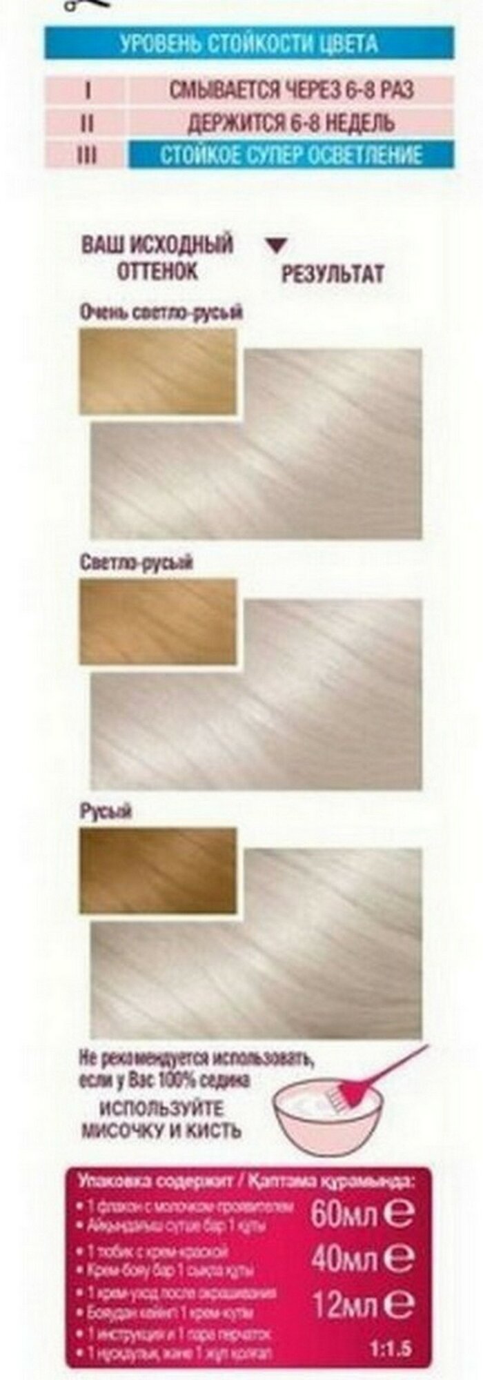 | Комплектация | - флакон с молочком-проявителем (60 мл),- тюбик с обесцвечивающим кремом (40 мл),- крем-уход после окрашивания (10 мл),- инструкция,- пара перчаток |