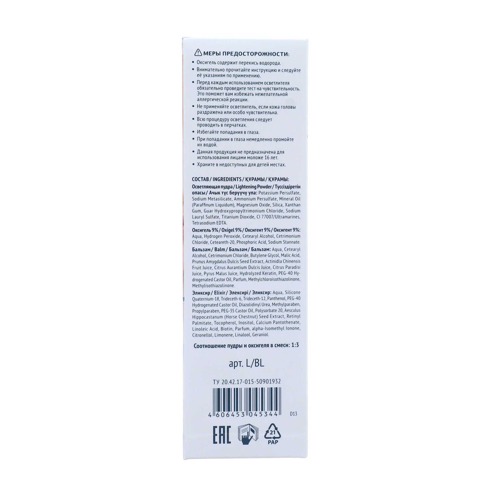 | Дополнительная информация | оксигелем 9% - 37.5 мл 2 шт, осветляющая пудра - 12.5г 2 шт, эликсир - 5 мл, бальзам - 15 мл |