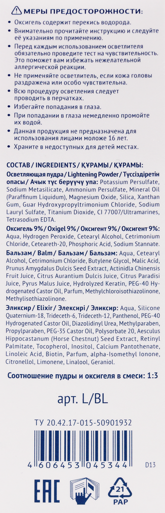 | Способ применения | приготовление смеси: смешайте содержимое двух пакетиков с осветляющей пудрой, добавьте оксигель из саше, добавьте ампулу эликсира и тщательно все перемешайте; Первое применение: быстро и равномерно нанесите осветлитель на сухие волосы, начиная от корней волос, стараясь избегать контакта с кожей; Нанесение на отросшие корни: нанесите осветлитель только на отросшие участки волос, разделяя их на пробор, стараясь избегать контакта с кожей головы. Не наносите смесь на ранее осветленные волосы; Максимальное время воздействия 30 минут; По истечении времени окрашивания тщательно промойте волосы большим количеством теплой воды, пока она не станет прозрачной. Рекомендуется после окрашивания вымыть волосы мягким шампунем |