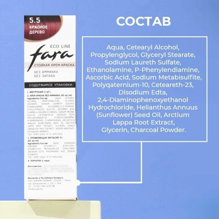 | Состав | Aqua, Cetearyl Alcohol, Propylenglycol, Glyceryl Stearate, Sodium Laureth Sulfate, Ethanolamine, P-Phenylendiamine, Ascorbic Acid, Sodium Metabisulfite, Polyqaternium-10, Ceteareth-23, Disodium Edta, 2,4-Diaminophenoxyethanol Hydrochloride, Helianthus Annuus (Sunflower) Seed Oil, Arctium Lappa Root Extract, Glycerin, Charcoal Powder. |