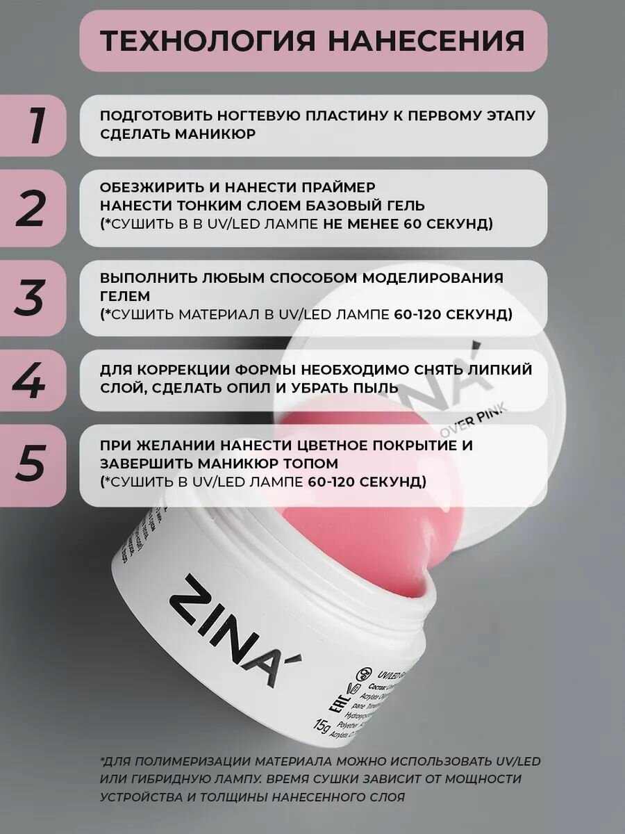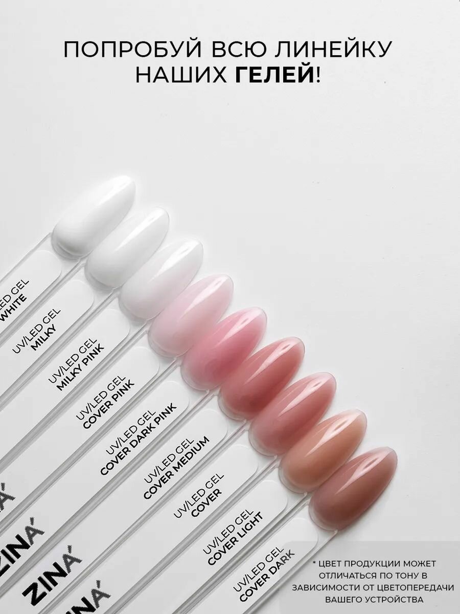 Гель для наращивания ногтей ZINA Cover Pink - розовый, для френча, самовыравнивающийся, 50 грамм, для лампы UV LED