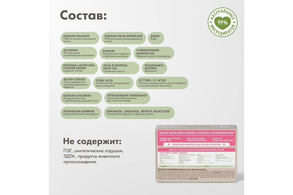 | Состав | Натриевые соли жирных кислот пальмового масла, натриевые соли жирных кислот пальмоядрового масла, вода, глицерин, натуральная отдушка, эфирное масло пальмарозы, гидролат пиона, оливковое масло, токоферил ацетат (витамин Е), цитрат серебра, лимонная кислота, пигмент минерального происхождения CI 77891, краситель CI 14720, хлорид натрия, тетранатрия этидронат, сорбат калия, гераниол*, линалоол*, бензил салицилат*. * - компоненты натурального эфирного масла и натуральной отдушки |