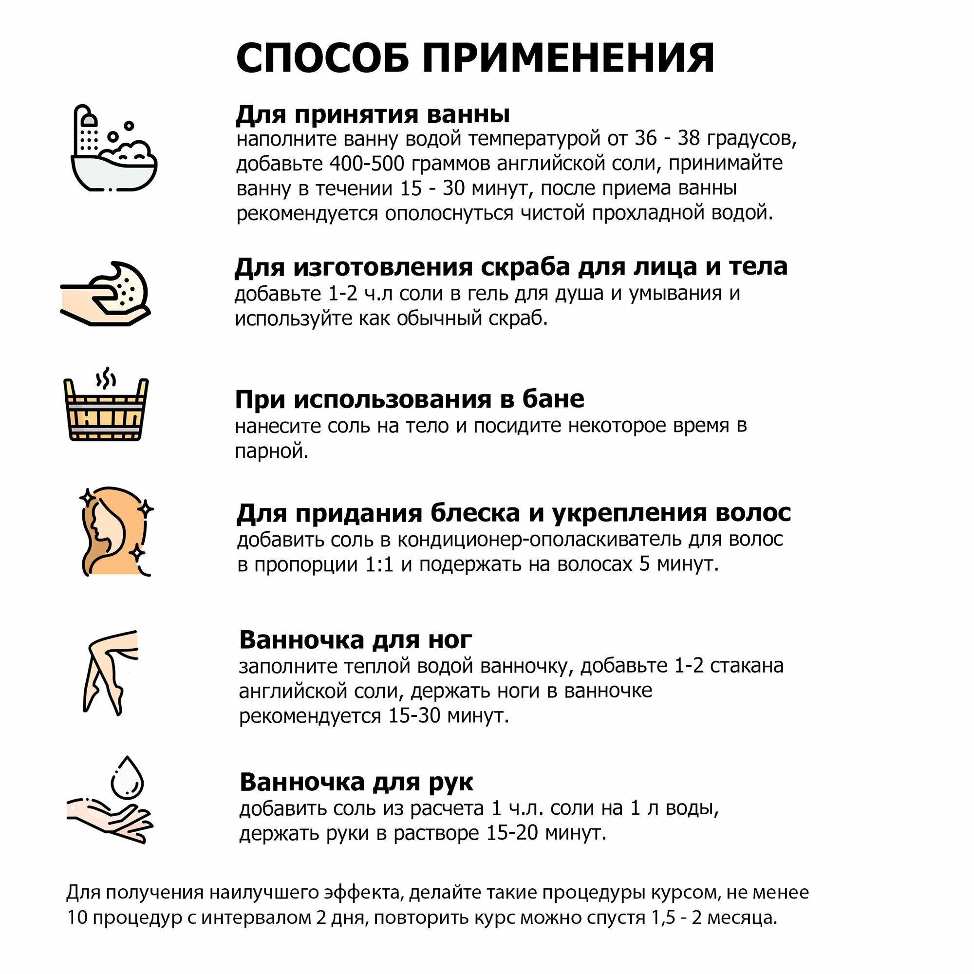 | Способ применения | для принятия ванн: наполните ванну водой температурой от 36 - 38 градусов, добавьте 400-500 граммов английской соли, принимайте ванну в течении 15 - 30 минут, после приема ванны рекомендуется ополоснуться чистой прохладной водой. Для изготовления скраба для лица и тела: добавьте 1-2 ч.л соли в гель для душа и умывания и используйте как обычный скраб. При использовании в бане: нанесите соль на тело и посидите некоторое время в парной. Для придания блеска и укрепления волос: добавить соль в кондиционер-ополаскиватель для волос в пропорции 1:1 и подержать на волосах 5 минут. Ванночка для ног: заполните теплой водой ванночку, добавьте 1-2 стакана английской соли, держать ноги в ванночке рекомендуется 15-30 минут. Ванночка для рук: добавить соль из расчета 1 ч.л. соли на 1 л воды, держать руки в растворе 15-20 минут. Для получения наилучшего эффекта, делайте такие процедуры курсом, не менее 10 процедур с интервалом 2 дня, повторить курс можно спустя 1,5 - 2 месяца. |