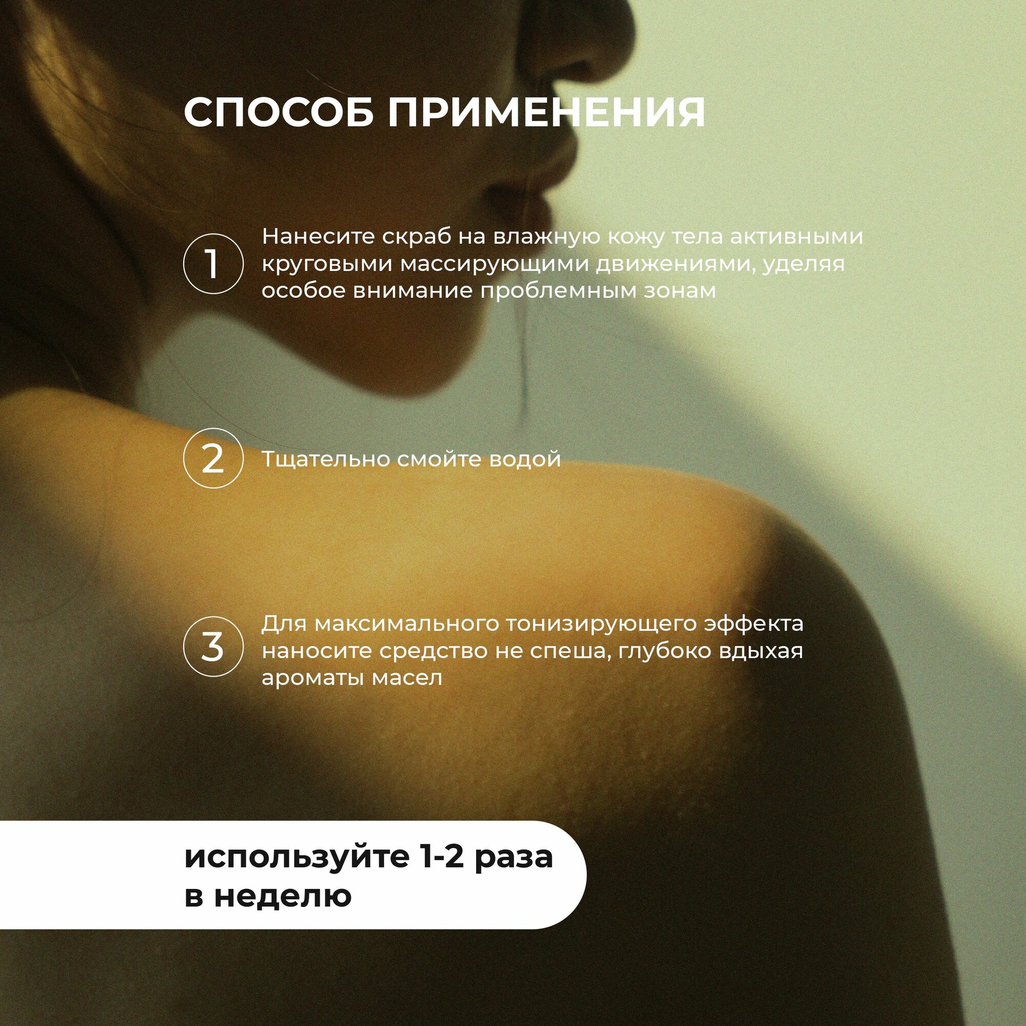 | Способ применения | используйте 1-2 раза в неделю. Нанесите скраб на влажную кожу тела активными круговыми массирующими движениями, уделяя особое внимание проблемным зонам. Тщательно смойте водой. Для максимального тонизирующего эффекта наносите средство не спеша, глубоко вдыхая ароматы масел. |