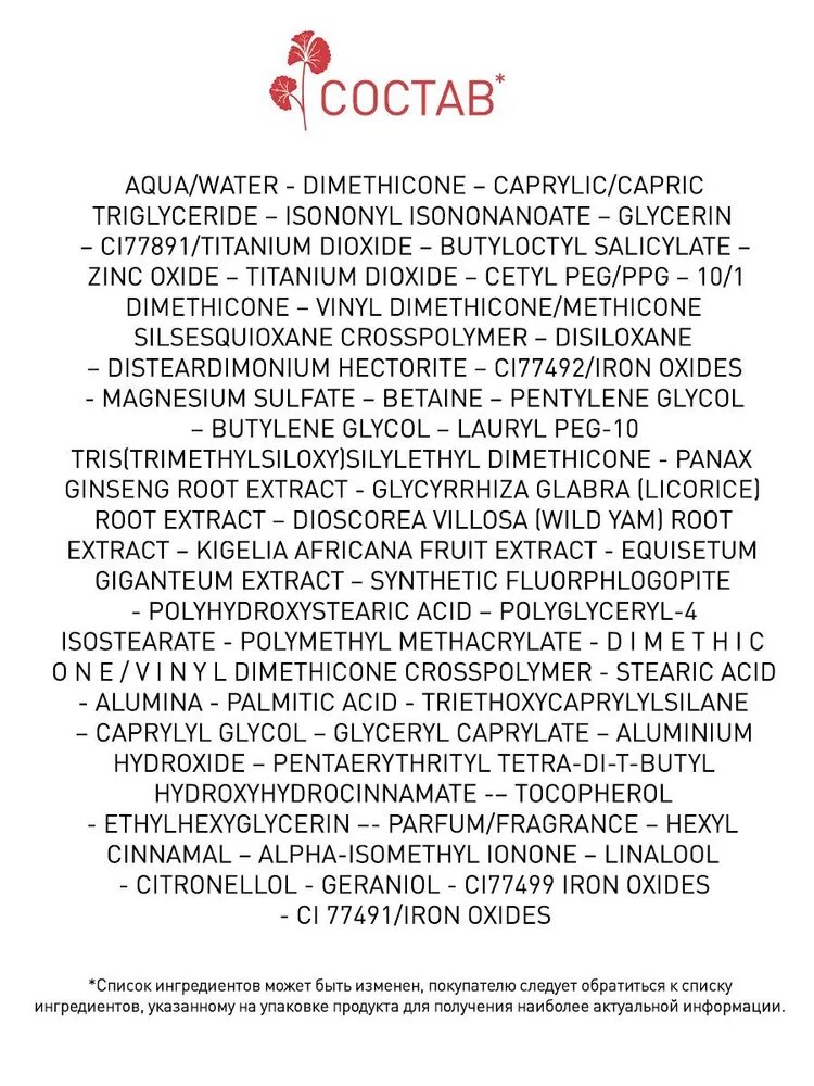 | Эффект | выравнивание поверхности кожи / защита от солнца / маскировка несовершенств / питание / разглаживание морщин / увлажнение |