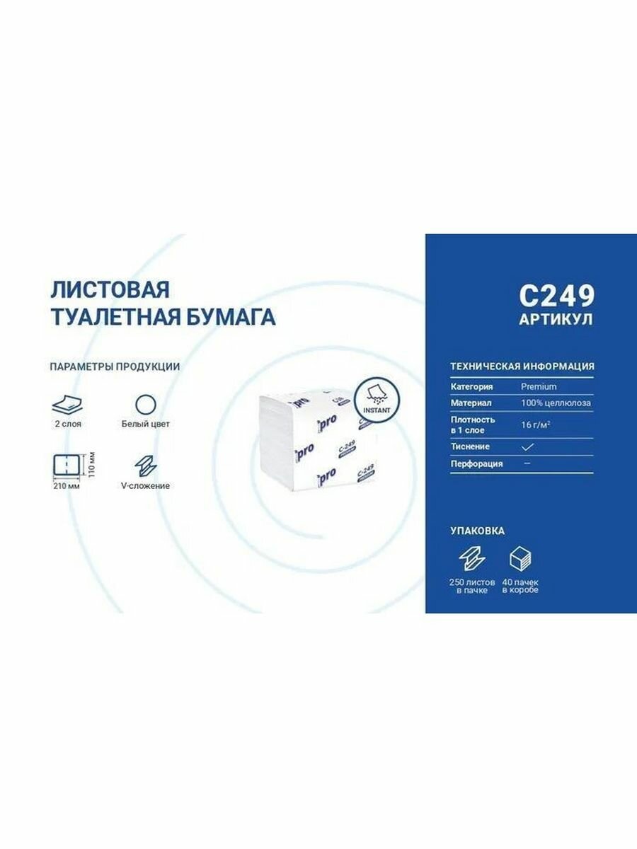 Туалетная бумага PROtissue 2-слойная 40 пачек по 250 листов (С249) Premium, с тиснением