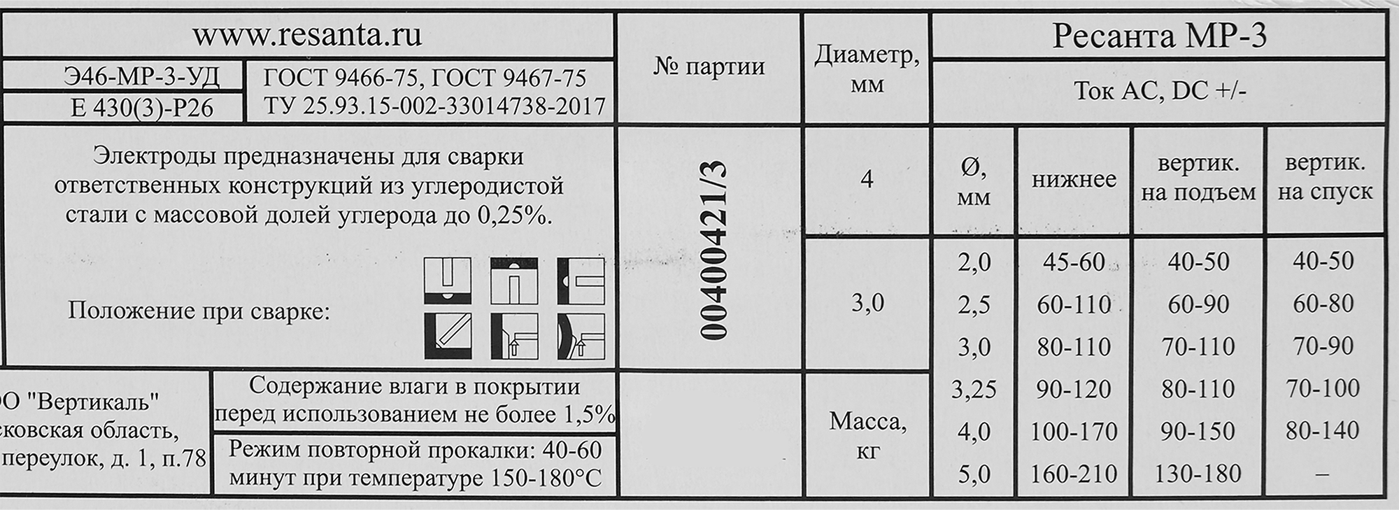 | Дополнительная информация | электроды РЕСАНТА относятся к высококачественным электродам типа МР-3 с рутиловым покрытием и изготовлены в соответствии с требованиям ГОСТ. |