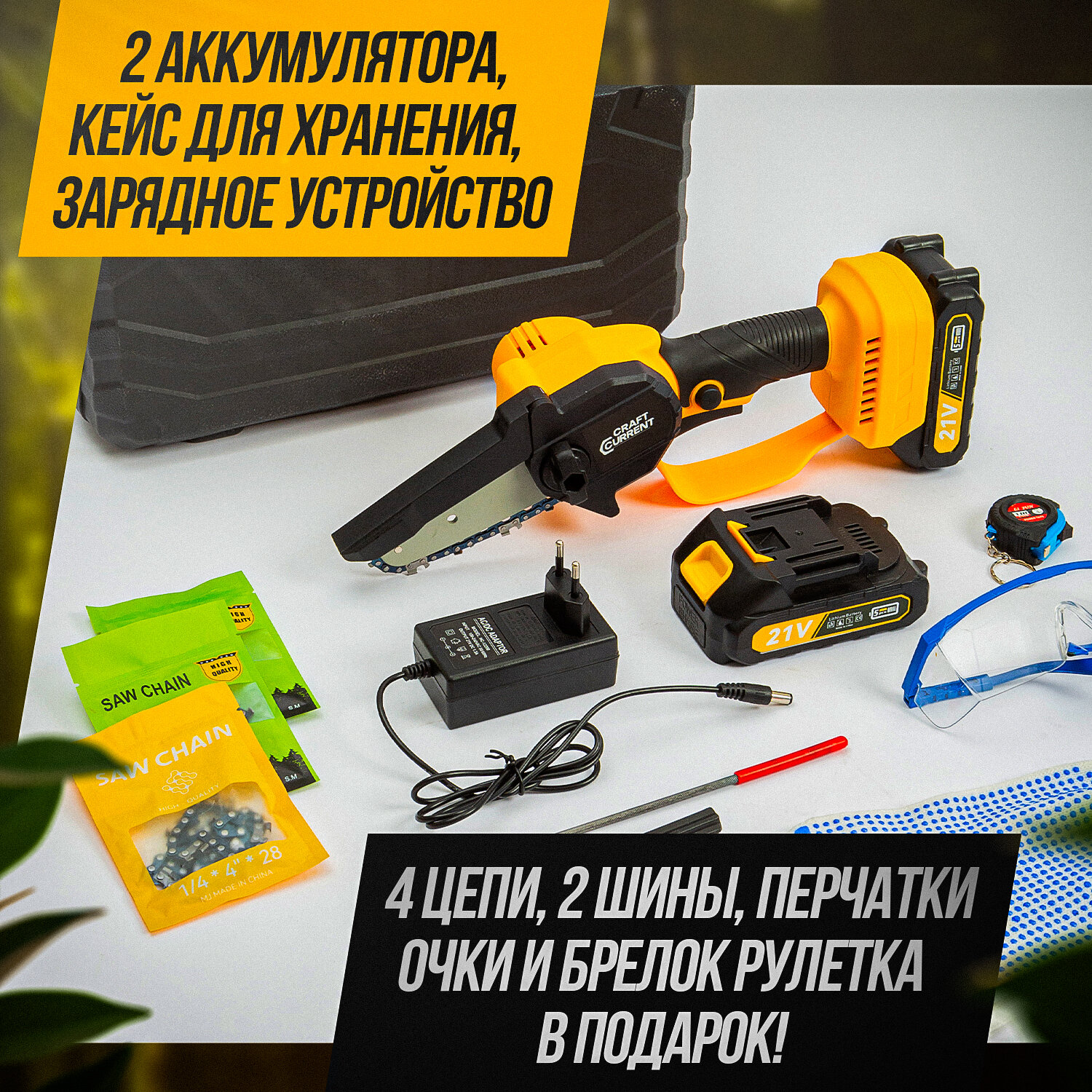 Купить Цепная пила CraftCurrent, 2 аккумулятора, 2 цепи в комплекте, антивибрационная, 21В
