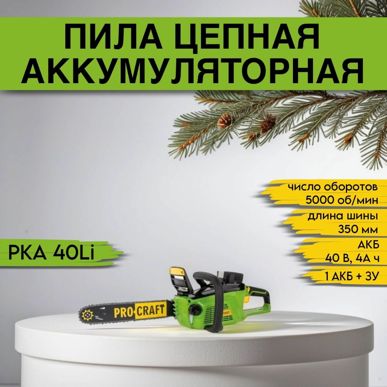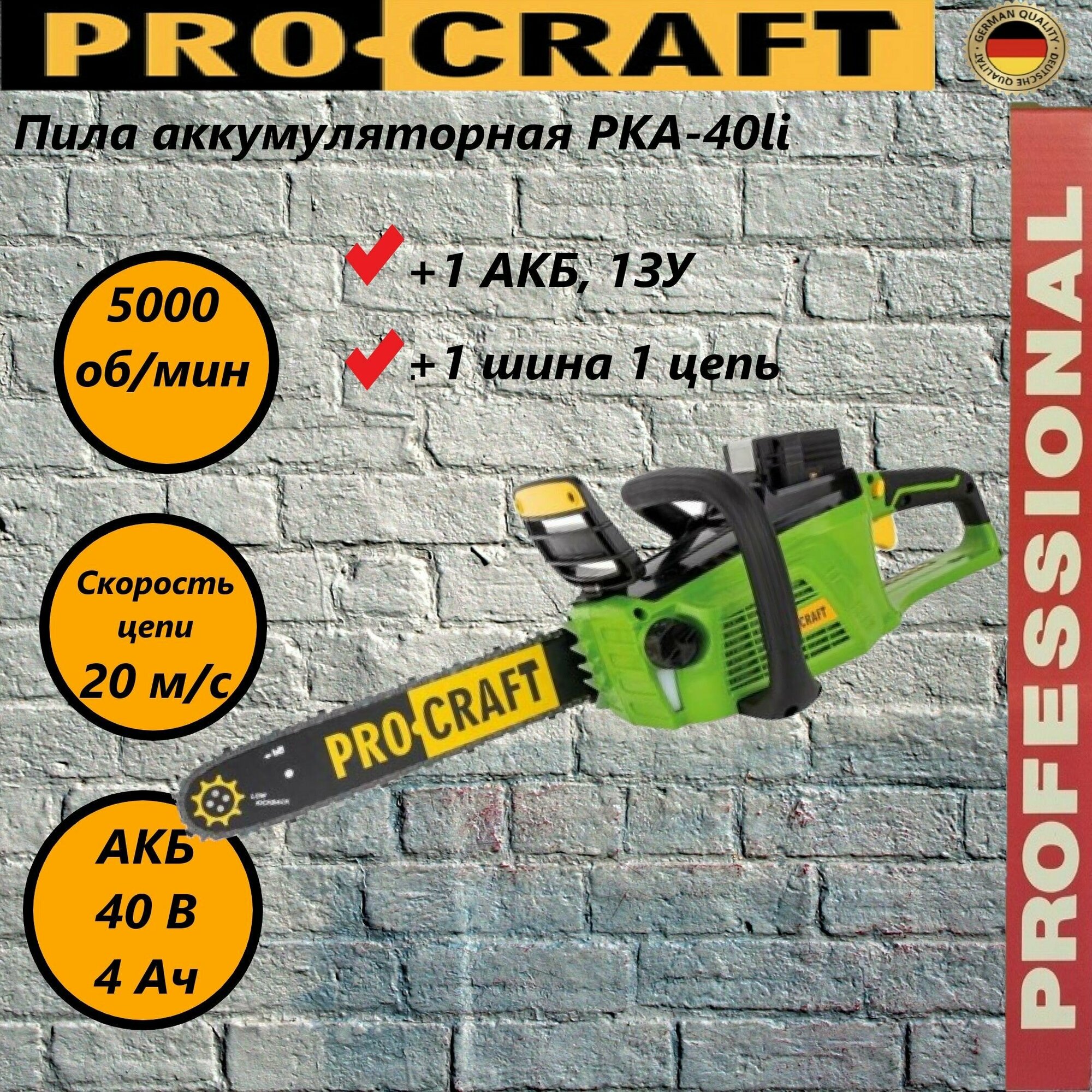 Пила цепная аккумуляторная Procraft PKA 40Li ( 1 акб, 1 зарядка), 350мм, 5000 об/мин, 20м/с