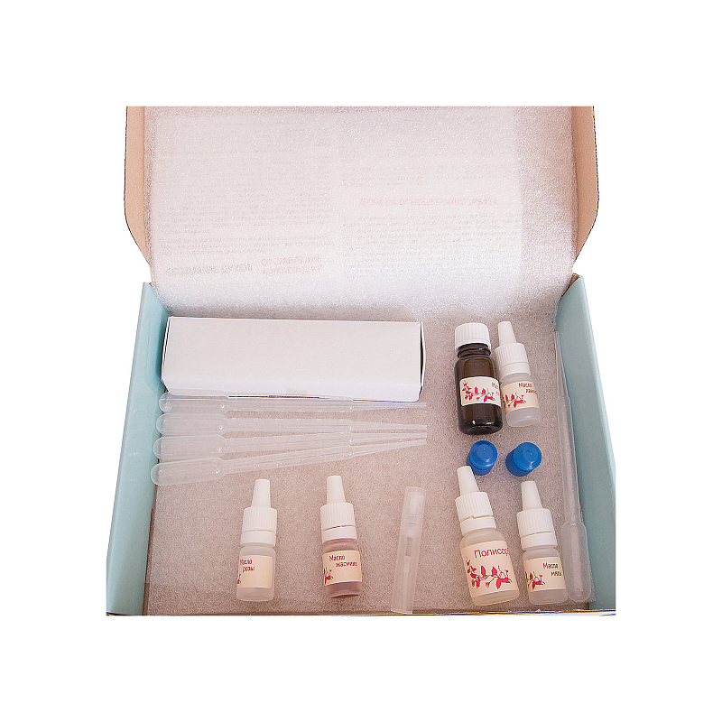 | Состав набора | парфюмерные масла пачули, жасмина, розы, мяты, лаванды; флакон-спрей; основа для духов; пипетки; пробирки; блоттеры; инструкция |