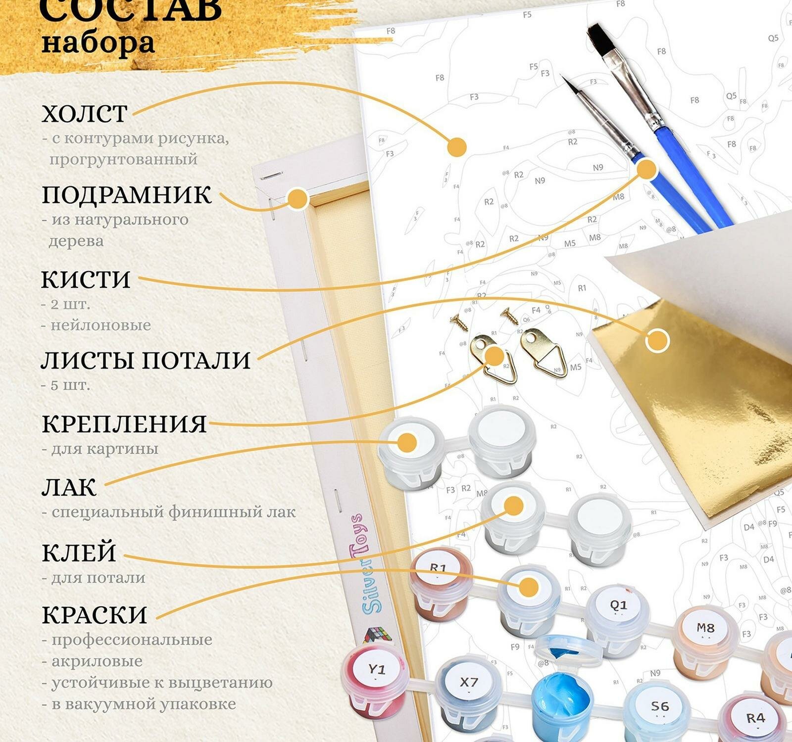 | Комплектация | холст из натурального хлопка на деревянном подрамнике (холст предварительно прогрунтован), 2 нейлоновые кисти разного размера, профессиональные акриловые краски (устойчивые к выцветанию), поталь (5 листов), финишный лак, фиксатор для потали. |