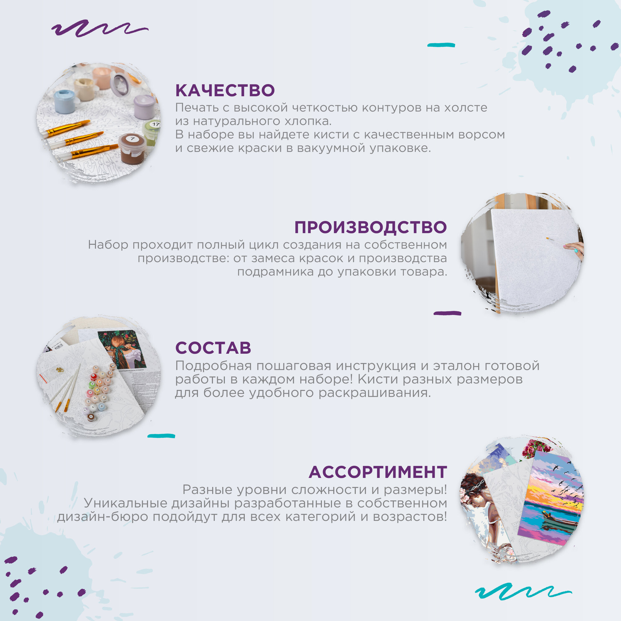 | Особенности | кисти в комплекте / краски в комплекте / репродукция картины |