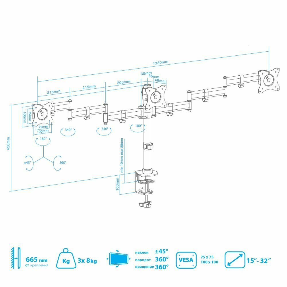Кронштейн для мониторов Arm Media LCD-T15 Для 3-Х 10"-32", max 3x10 кг, 5 ст свободы, поворот на штанги 360°, высота штанги 450мм, maxVESA10