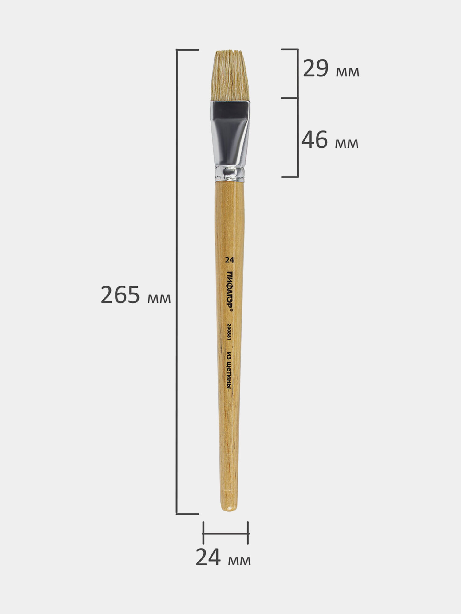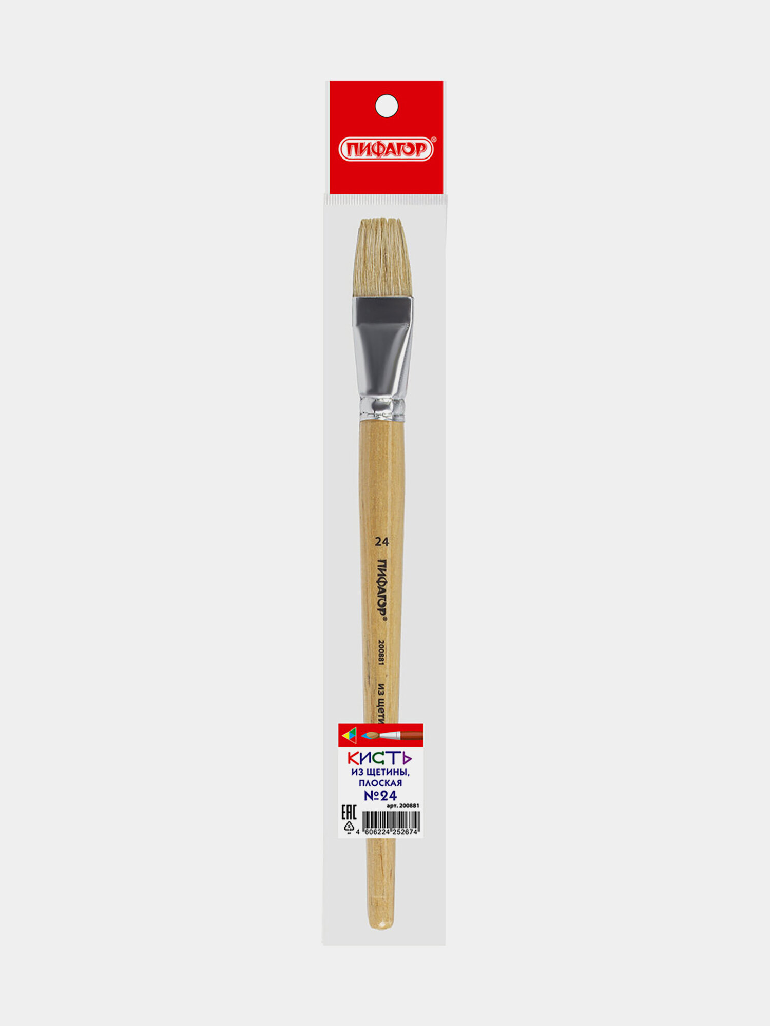 Кисть пифагор, щетина, плоская, № 24, деревянная лакированная ручка, пакет с подвесом, 200881