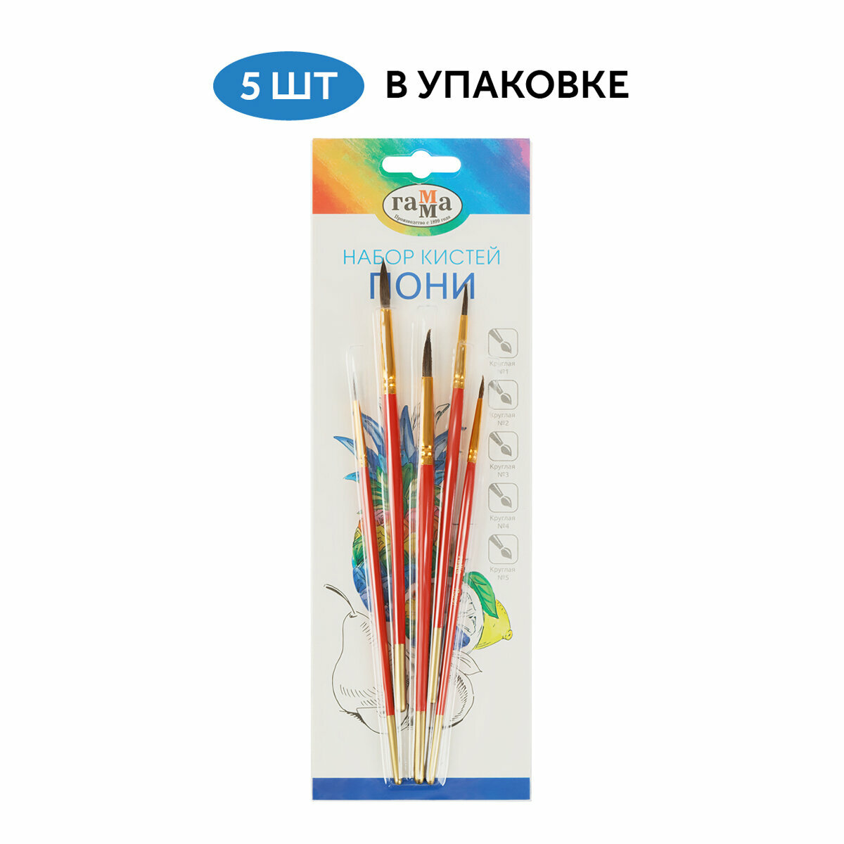 Набор кистей Гамма , 5 шт, пони, круглые №1,2, 3, 4, 5, блистер