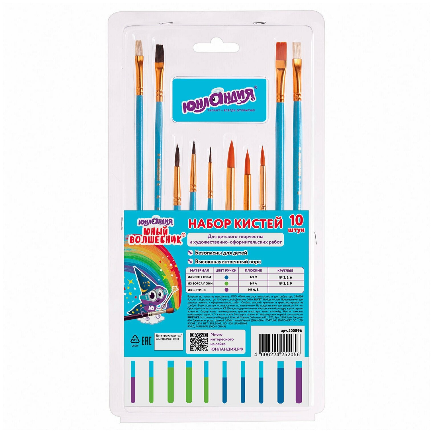 Кисти Юнландия Юный Волшебник, набор 10 шт. (Пони - 4 шт.; Синтетика - 4 шт.; Щетина - 2 шт., круглые, плоские), блистер, 200896