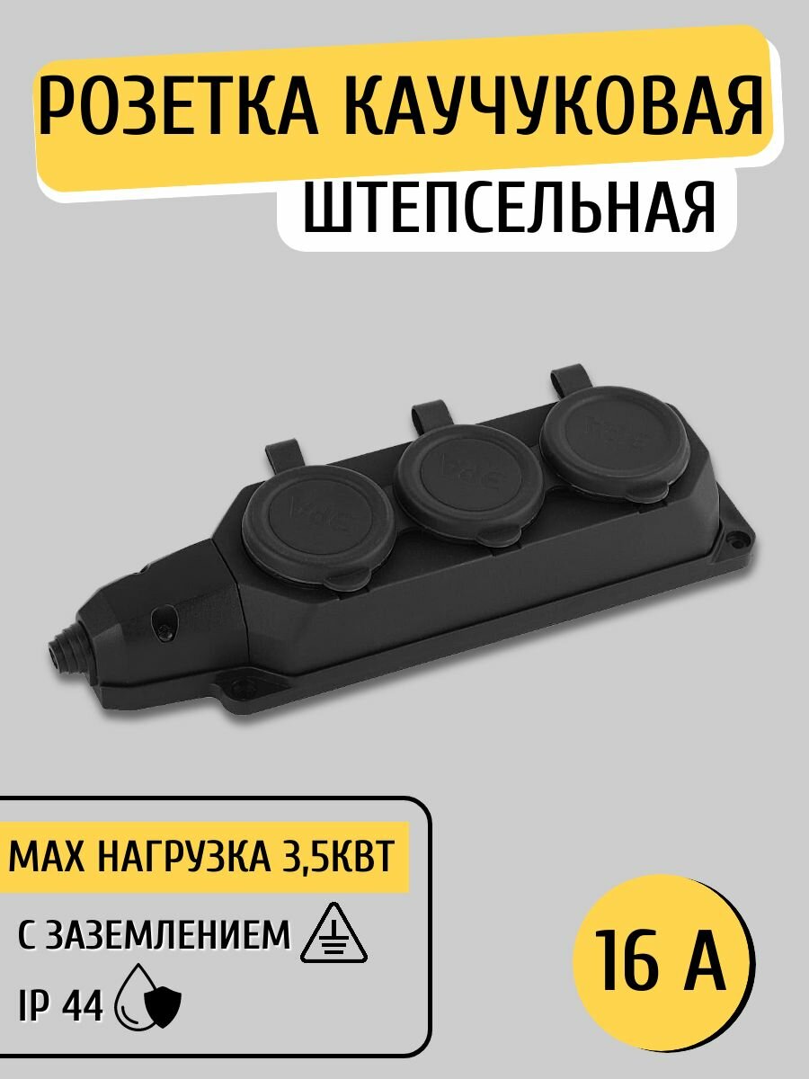 Колодка розеточная электрическая каучуковая ЭРА K-3e-B-IP44 влагозащищенная герметичная на 3 розетки, 16А